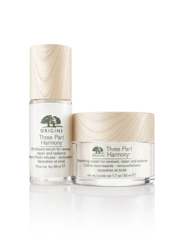 Origins nieuwste botanische doorbraak is de voedende Origins Three Part Harmony-lijn. De lijn bestaat uit een oil-infused serum en een crème met als belangrijk ingrediënt de leliebol van de narcis die staat voor vernieuwing, in dit geval celdeling. Beide producten zijn speciaal ontwikkelt voor de 50+ huid die onder andere verliest aan veerkracht en vaak droog aanvoelt. Ander ingrediënt is het sterke antioxidant duizendknoop. Samentrekkend - en dus herstellend - is mirte, dat is een kruid. Vochtverlies wordt opgevangen door komkommer-, en algenextract.