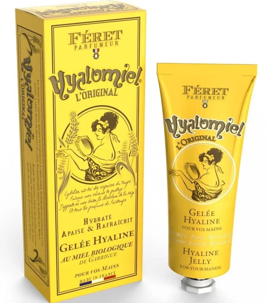 On first glance at Féret Parfumeur’s Hyalomiel “jelly” for your hands, there is no doubt that this product must have a long history. The warm yellow packaging is elegantly nostalgic with typography that is trés français!