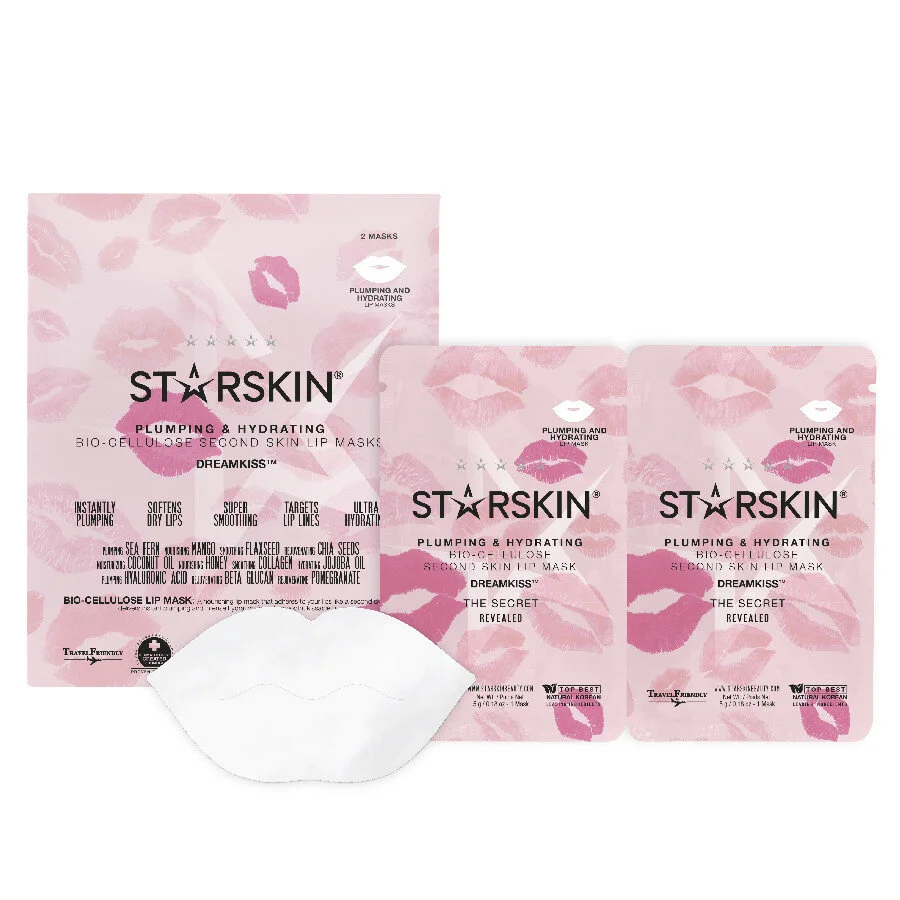 Tot slot Dreamkiss, een lip plumping masker van Starskin. Uit sinds augustus, en voor € 9,95 - twee stuks - exclusief verkrijgbaar bij Douglas. Starskin timmert al een tijdje succesvol aan de weg met bio-cellulose maskers – voor het gezicht, voeten en handen en nu dus ook lippen. Plump-ingrediënten zijn hyaloronzuur dat zorgt voor een zwelling van de huid en zeevarens die de synthese van liptiden stimuleren waardoor cellen in volume toenemen met als resultaat vollere lippen.