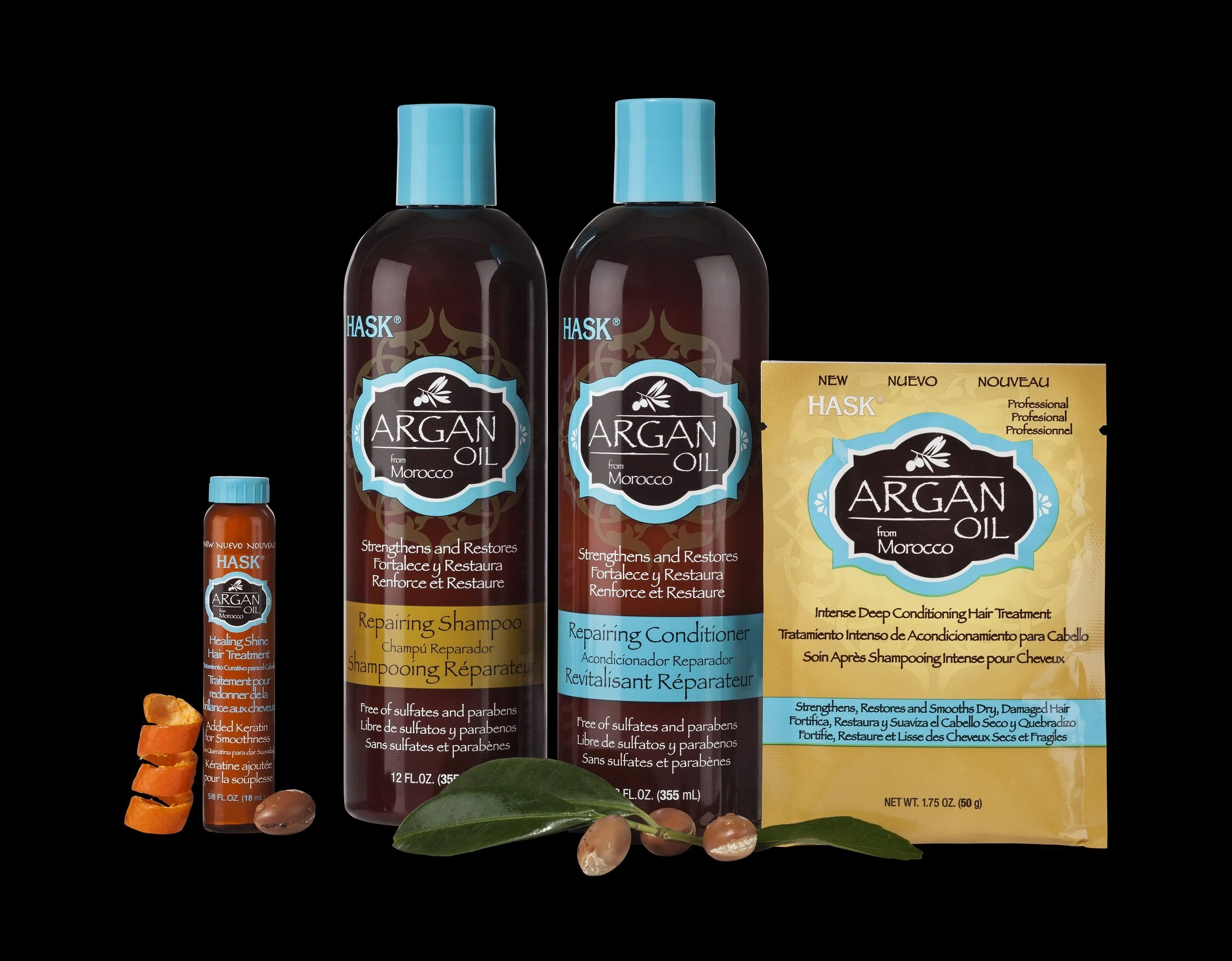 Hask Argan Oil Repairing Shampoo €8,99. Conditioner €8,99, Deep Conditioner €3,45, Shine Oil € 3,45.