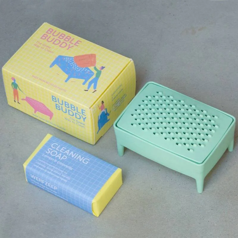 Bubble Buddy werkt als een rasp, maar nee dit fraaie product is géén kaasrasp. Het ‘bedje’ blijkt een zeeprasp. Als je bent uitgeraspt keer je het bedje om en leg je de handgemaakte zeep op de zeephouder. De geraspte zeep die gooi je in warm water, en je hebt een multifunctioneel sopje voor de vaart, voor het huis, voor de vuile was of je handen of in bad.