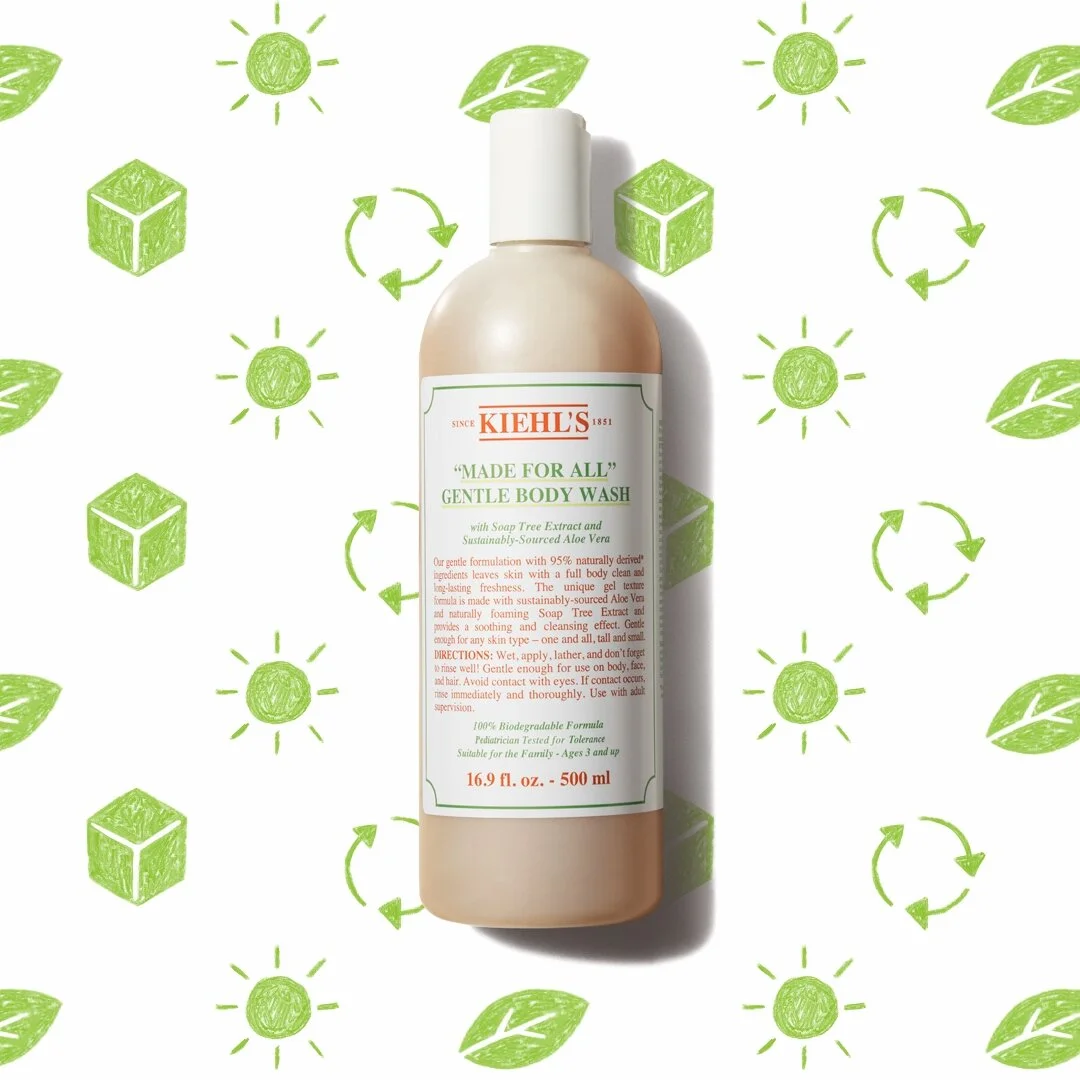 Belangrijk ingredient van deze reinigende formule is het hydraterende en kalmerende Aloë Vera dat al eeuwenlang wordt gebruikt in de traditionele en kruidengeneeskunde. Het extract van de Zeepboom zorgt voor zacht en luchtig schuim. Kiehl’s “Made For All” Gentle Body Wash” bevat 95% ingrediënten van natuurlijke oorsprong en de verpakking is voor 100% biologisch afbreekbaar. Het product strookt volledig met de vijf pijlers van het Kiehl’s Made Better-concept en is het eerste dat gelanceerd wordt als deel van het nieuwe duurzaamheidsplatform waarmee Kiehl’s zijn doelstellingen op het gebied van duurzaamheid wil bereiken