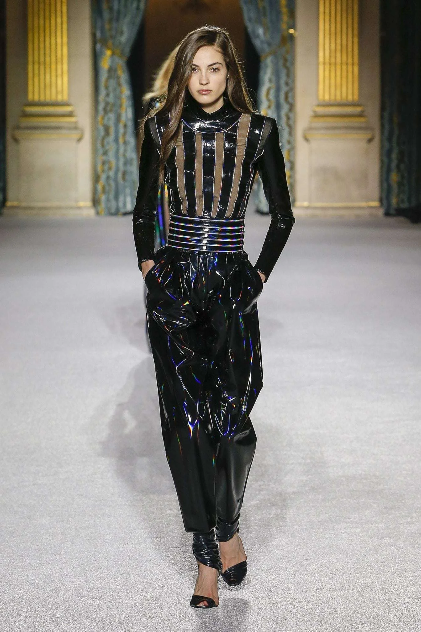 In deze show kwamen ook enkele uitgesproken lak looks voorbij. Hoogglanzend zwart lakmateriaal komt terug in het schattige Balmain Hair Couture Cosmetic Bag, het is polstasje inclusief een tube Moisturizing Shampoo, Moisturizing Conditioner en de bestseller Silk Perfume.