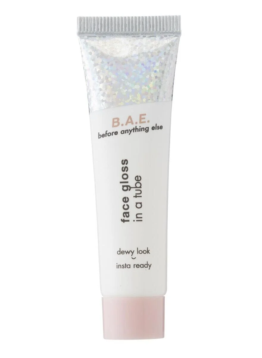 Spotgoedkope glittergloss in een handige tube. Voor een fris dewy gezicht en/of lichaam. B.A.E Facegloss Hema. 02 Glitter €,450. Via Hema.nl