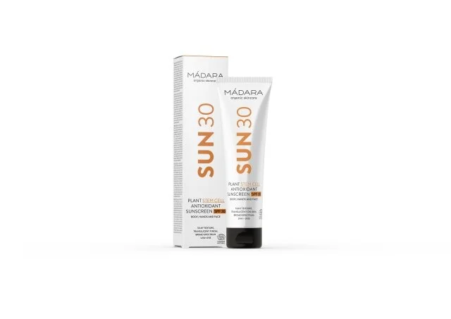 Het formuleren van natuurlijke-SPF producten is één van de meest complexe uitdageningen in de skincare markt. Mádara werkte jaren aan zonneproducten zonder synthetische zonnefilters (alternatief: minerale filters) die geen witte waas achterlaten en evenmin plakkerig aanvoelen. Mijn favoriet is Mádara’s SPF 30 Age-Defying Suncream Plant Stem Cell, het voelt zijdezacht, ruikt hemels en beschermt en verzorgd (€29 40ml). Een van de ingredienten is hyaluronzuur en biedt de huid intense hydratatie en voorkomt uitdroging.