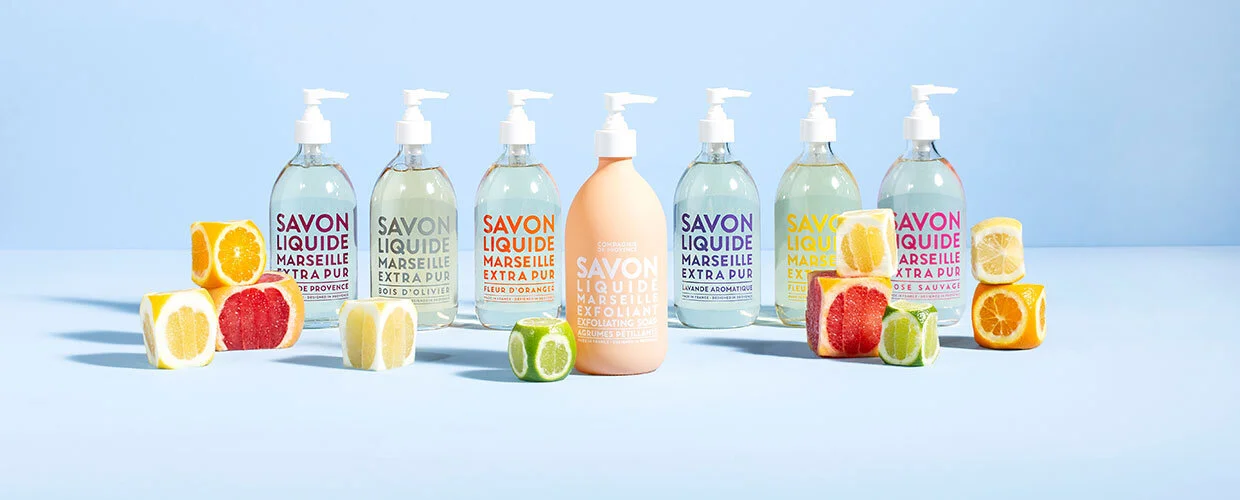 Compagnie de Provence. Marseille Soap Cubes 400gr €5,50, Liquid Marseille Soap 495ml €15,50, Black Soap 500ml €13. Cleaning Sprays 500ml €11, Liquid Dish Soaps 500ml €11. Te koop via Babussu.nl en Babassu filialen