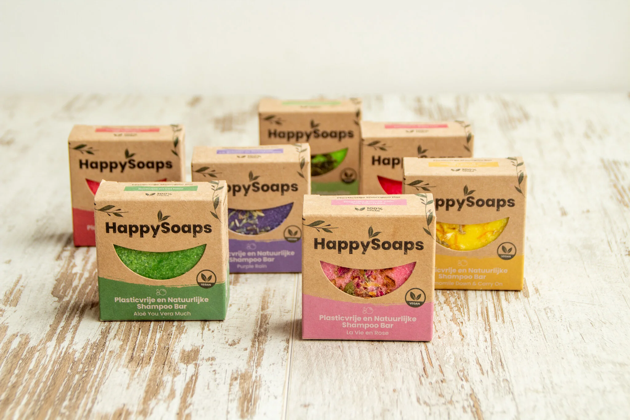 HappySoaps. Shampoo Bars 70gr €8,75 – 90-110 wasbeurten. Een giftbox met 3 shampoo bars €24,95. Via happysoaps.com