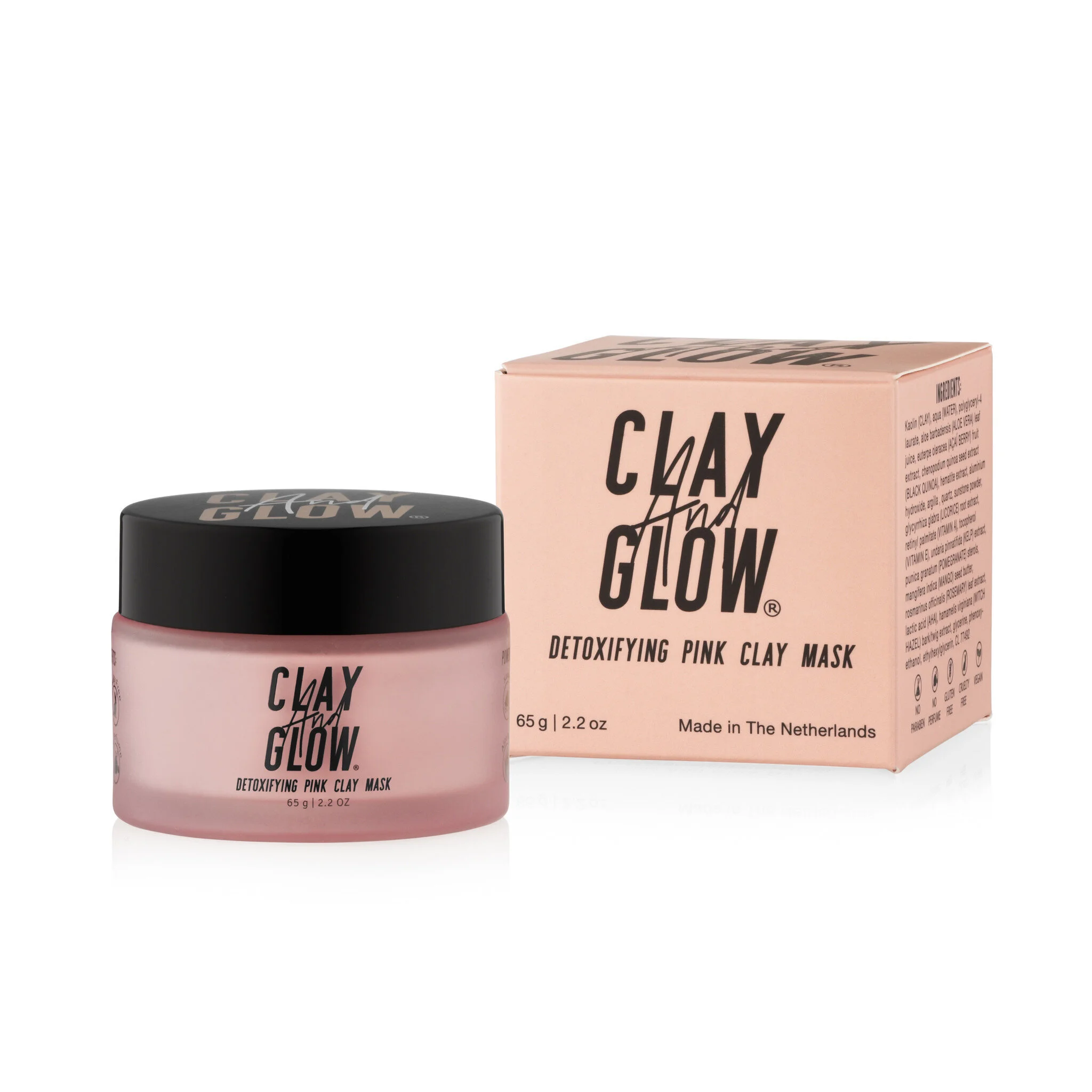 De hoofdingrediënten van het nieuwe Nederlandse Clay and Glow zijn hydraterende aloé vera (bestaat voor 99% uit water), het ontstekingsremmende acai en roze klei, een mix van rode klei, beige klein met minerale poeder. Deze effectieve klei-combinatie is geschikt voor elk huidtype. Het is vegan proof en op de conserveringsmiddelen na bijna helemaal natuurlijk. HOE? Breng een dun laagje aan op je gezicht, 10 minuutjes laten intrekken en afspoelen met warm water.