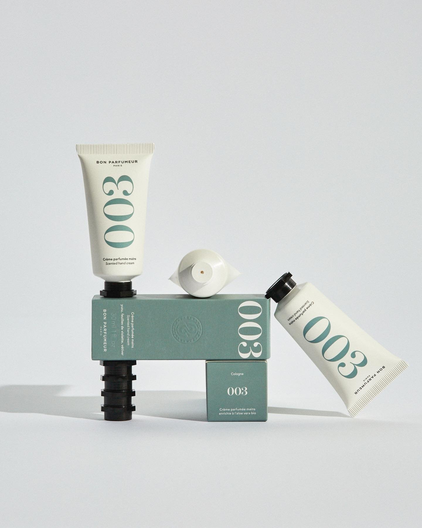 Het Franse Bon Parfumeur richt zich met spannende geuren op de meer nieuwsgierige parfumliefhebbers. Onlangs lanceerden ze The New Body Collection met als uitgangspunt hun bestsellers 003, 101 en 801 als vaste zepen en handcrèmes voor zachte geparfumeerde handen. De handcrème formule is verrijkt met biologische Aloë Vera en biologische Shea Butter. De crèmes hebben een lichte formule en trekken snel de huid in. De geparfumeerde zeep is verrijkt met Franse, biologische Camelina plantaardige olie en laten net als de crèmes eengeurspoor achter, de hele dag lang.