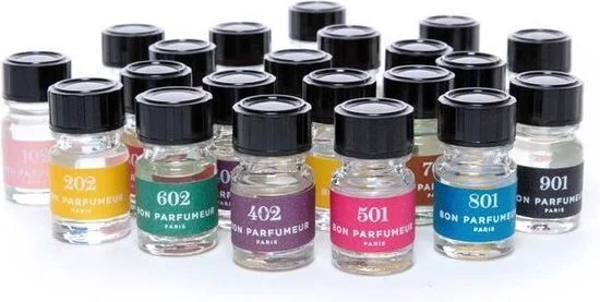 De parfums zijn allemaal te herkennen aan hun driecijferige nummers en hun kleurrijke labels. Ze passen allemaal in één van de volgende geurfamilies: cologne, bloemig, fruitig, amber & kruidig, hout, aromatisch, aquatisch en speciaal. Bon Parfumeur raadt aan om twee of drie geuren met elkaar te combineren. Op deze manier geven ze hun gebruikers de kans om hun eigen parfumeur te worden en om hun eigen geur te creëren die past bij hun wensen en stemming op het moment. Ook zijn alle geuren genderneutraal.
