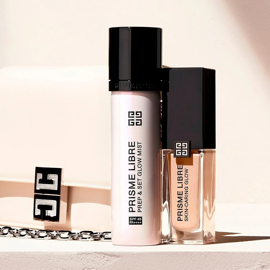 Deze is bovendien hydraterend en verfrissend en smelt als het ware na het aanbrengen meteen in de huid. Vervolgens breng je de make-aan. En die zit dan prachtiger dan ooit. Schudden voor gebruik en spray vanaf een afstand van 30 cm met gesloten ogen om een gelijkmatige bescherming te garanderen. Prisme Libre Prep & Set Glow Mist is luxe verpakt, gegraveerd met het Givenchy-logo en een zilveren warmgestempeld 4G-monogram. De parelmoerroze afwerking van de buitenste verpakkingsfles weerspiegelt de stralende make-upafwerking van de Prisme Libre Prep & Set Glow Mist. Het praktische ronde formaat van 70 ml maakt het mogelijk om de nieuwe primer en setting spray overal mee naartoe te nemen en is ideaal om je make-up de hele dag door op te frissen.