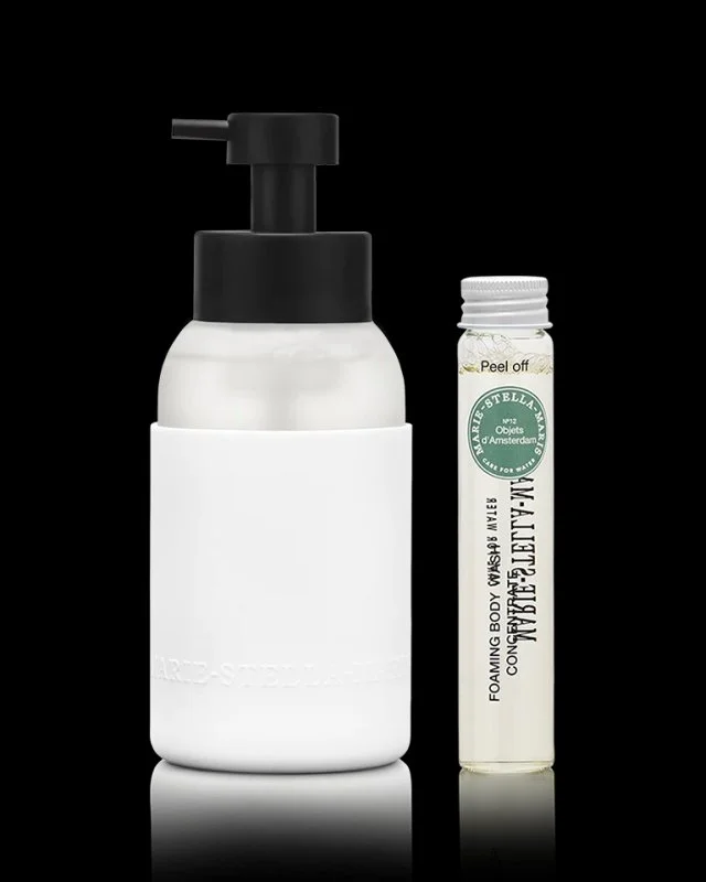 De Foaming Body Wash fles is eindeloos navulbaar met water en Marie-Stella-Maris concentrates en daarmee een duurzaam product. Op de ampul zit een verwijderbare sticker die je bovenop het pompje kunt plakken, zodat je altijd weet welk geurconcentraat in de fles zit. Ik zou zeggen, probeer ze allemaal, de nieuwste is No.07 Voyage Vétiver. De mooie, tijdloze designfles past qua stijl in elke badkamer.