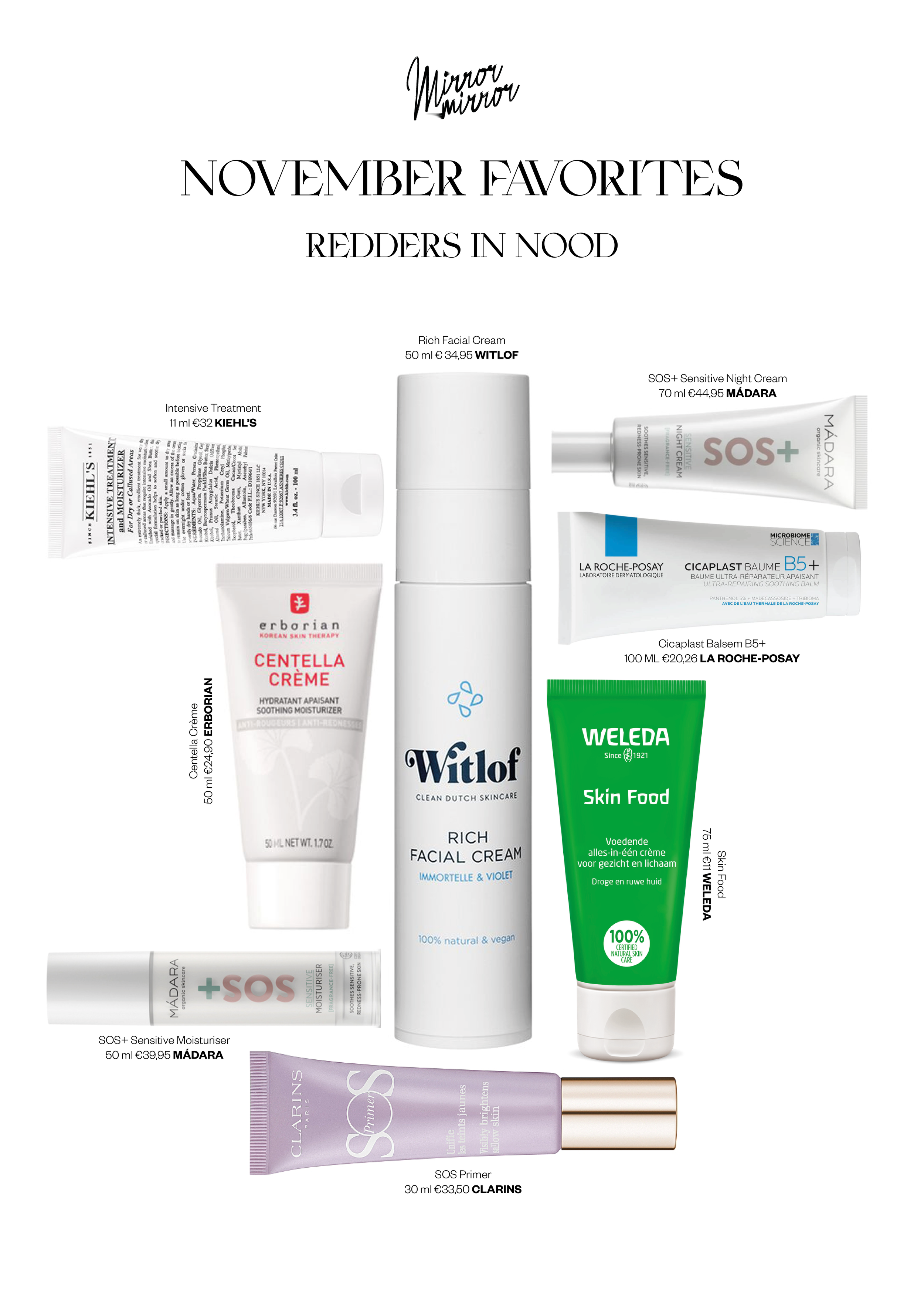 MÁDARA SOS+ Sensitive Night Cream 70ml €44,95 / WELEDA Skin Food 75ml €11 / WITLOF Rich Facial Cream 50ml € 34,95 / CLARINS SOS Primer 30ml €33,50 / KIEHL’S Intensive Treatment 11ml €32 / MÁDARA SOS+ Sensitive Moisturiser 50ml €39,95 / ERBORIAN Centella Crème 50 ml €24,90 / LA ROCHE-POSAY Cicaplast Balsem B5+ 100ML €20,26