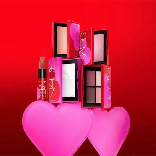 Om verliefd op te worden; de romantische roze en rode verpakking van de gelimiteerde NARS Valentijn collectie versierd met een royaal hart.