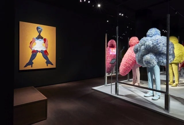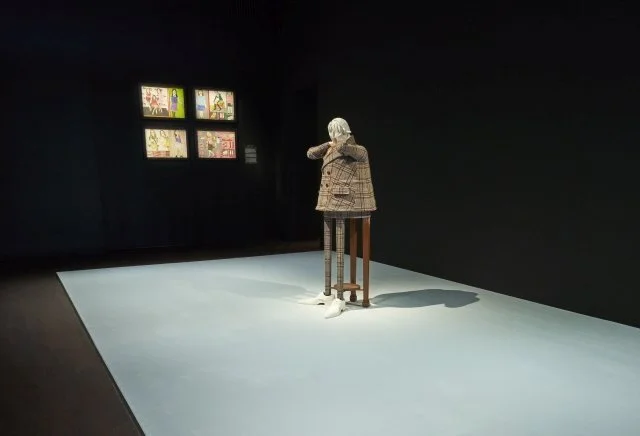 In Antwerpen staat dus het lichaam centraal. Curatoren Romy Cockx en Elisa de Wyngaert tonen ons hun onderzoek naar onderlinge verbanden tussen mode, zelfbeeld, identiteit. En de kracht van mode. Dat imperfectie altijd boeiender is dan het zoveelste gladgestreken snoetje of het perfecte lichaam, wordt in Antwerpen meteen duidelijk gemaakt met I Feel Perfectly Terrible, een sculptuur uit 2021 van een cartoonesk mannetje met houten spillepootjes. Het absurde beeld van maker Dirk Van Saene trekt je meteen de tentoonstelling in.