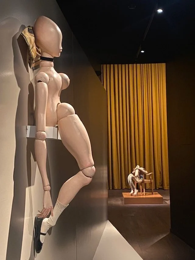 Tot zover de pop als drager van mode. Verontrustender zijn de pop-sculpturen van Hans Bellmer uit de jaren zeventig met de vrouw als een soort van bouwpaket, met een enkele borst, overdreven lange arm en ogenloze hoofd. Van meer esthetische aard is een buste van Ed Tsuwaki met een langgerekte giraffennek en een Twiggy-achtig hoofd.