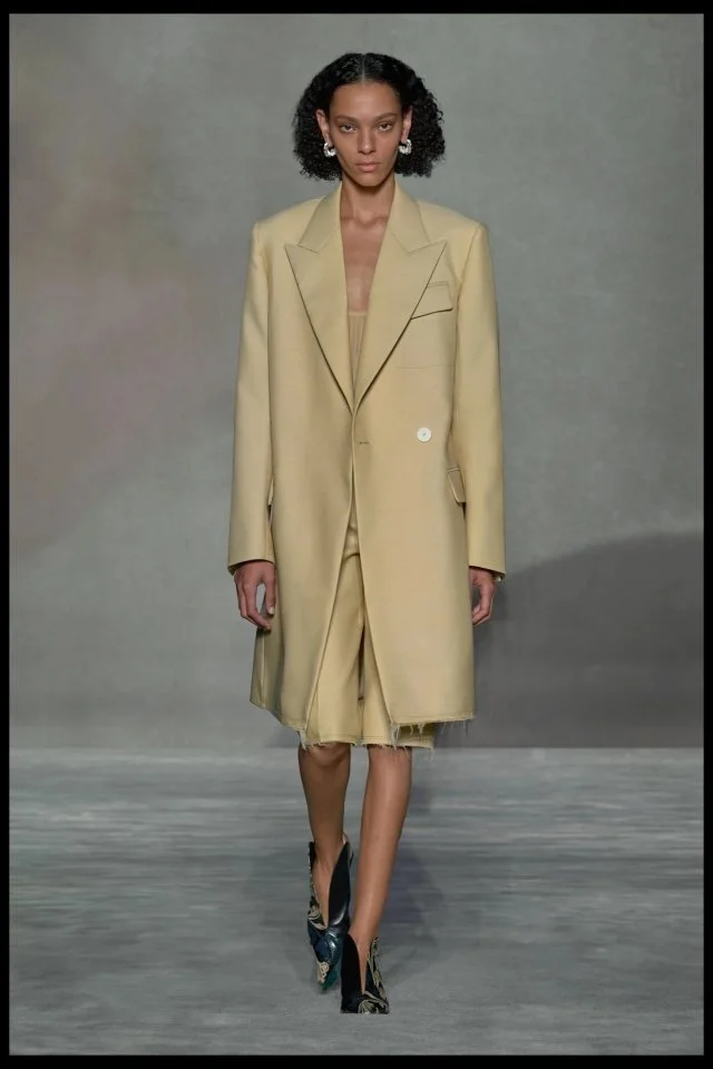 Sialelli opende de show met een oversized blazer met ruim gesneden loshangende panden; een detail dat mij – als Lanvin-fan – al jaren geleden opviel in de Parijse Lanvin boutique toen ik daar een shirt paste en dezelfde vorm was gebruikt.