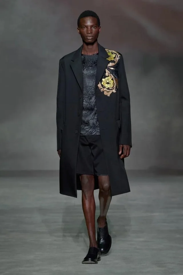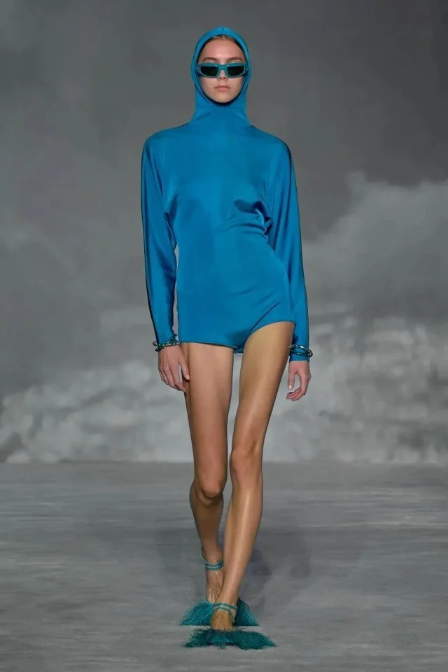 Sialelli nam ons mee naar een strand waar projecties van serene golven de weg vrijmaakten voor zijn creaties. Hier en daar knipoogde de ontwerper naar de zomer met een azuurblauw, badpakachtige look die met bijpassende zonnebril zo het water in kan. Schoenen hadden soms de vorm van flippers maar dan met veel franjes, waarmee je al flanerend aan elke kust de show steelt. Doorzichtige hoedjes waren als een geüpgraded versie van de badmuts met ogen als fonkelende kwallen op het hoofd. Toch schreeuwden geen van deze ontwerpen, met soms geborduurde details, om aandacht. Ze straalden een ingetogen elegantie en rust uit.