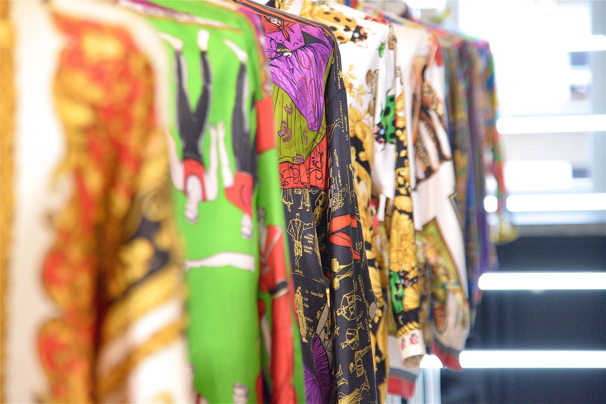 Zijn diverse invloeden zijn ook goed te zien in de zo’n vijftig gedessineerde blouses op de expositie. Saskia Lubnow: ‘Versace lanceerde de eerste collectie blouses rond 1990, en hij begreep dat hij ‘oude’ inspiratie kon vertalen tot iets nieuws en was hierin heel inventief. In 1992 kwam hij met het succesvolle Seashell-dessin, in 1993 met Barok gemixed met Miami. Elk jaar verschenen er meer varianten tot 1995, toen eenvoudiger dessins zijn voorkeur kregen.’