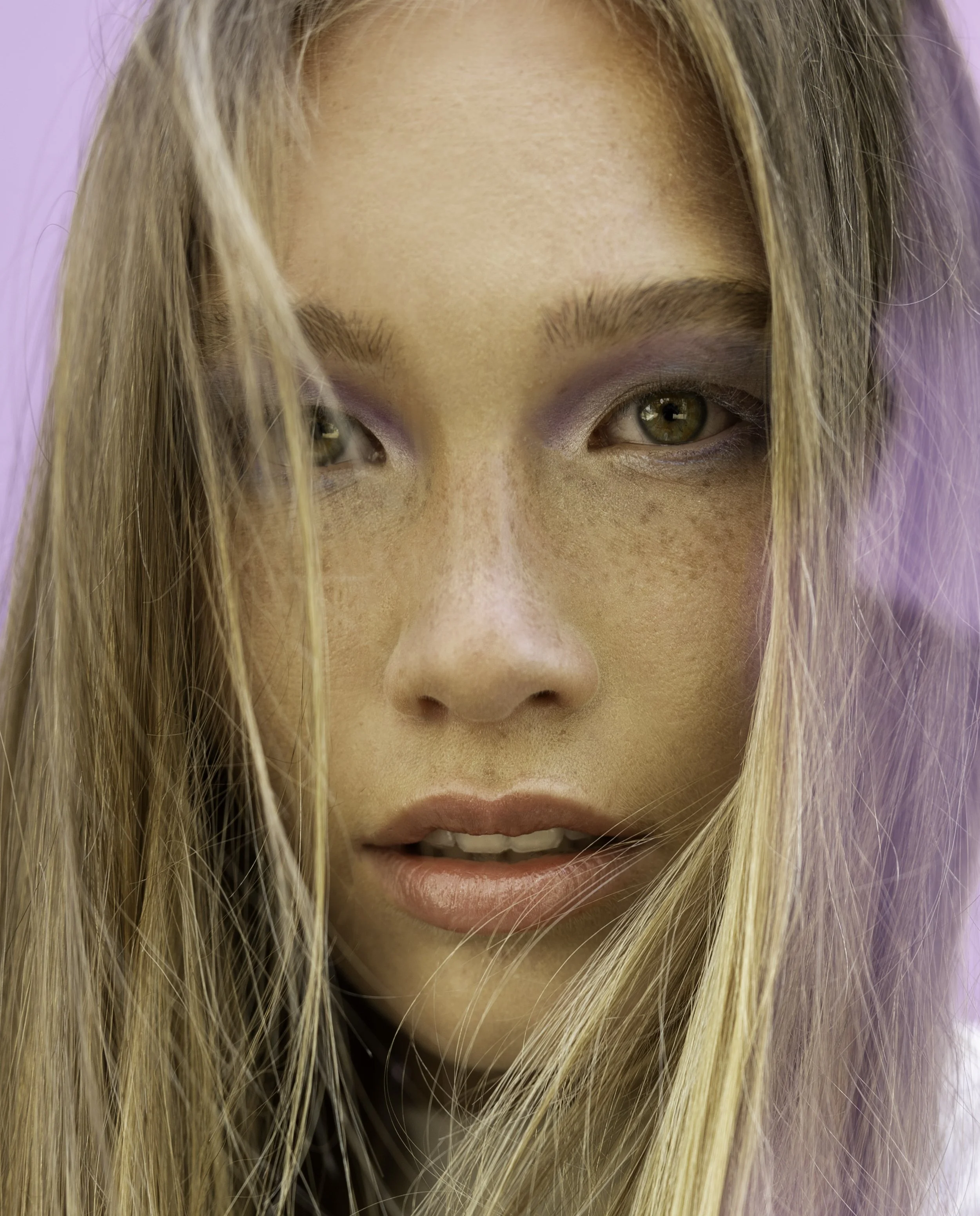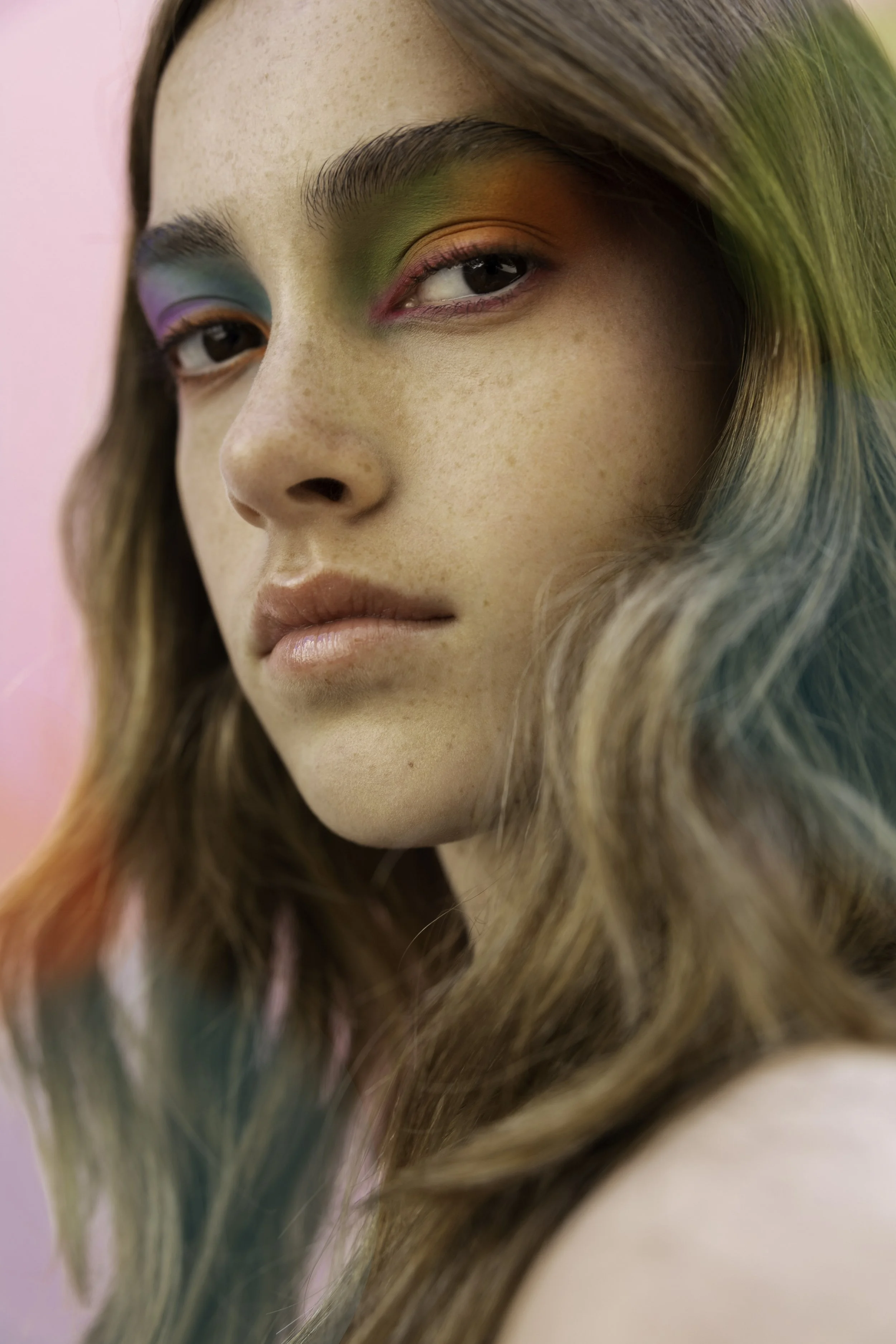 “Dat is het werk van de Nederlandse kunstenaar Martine Johanna. Ik zag haar schilderijen voor het eerst in MIRROR MIRROR #11 . Wat mij beviel was haar kleurgebruik, heel poetisch. Eigenlijk zie je stuk voor stuk rare kleuren die eigenlijk niet bij elkaar passen in één schilderij, maar als geheel werkt het tóch. Ik wilde dat de make-up looks van de studenten een tere uitstraling hadden. Dat is gelukt!”