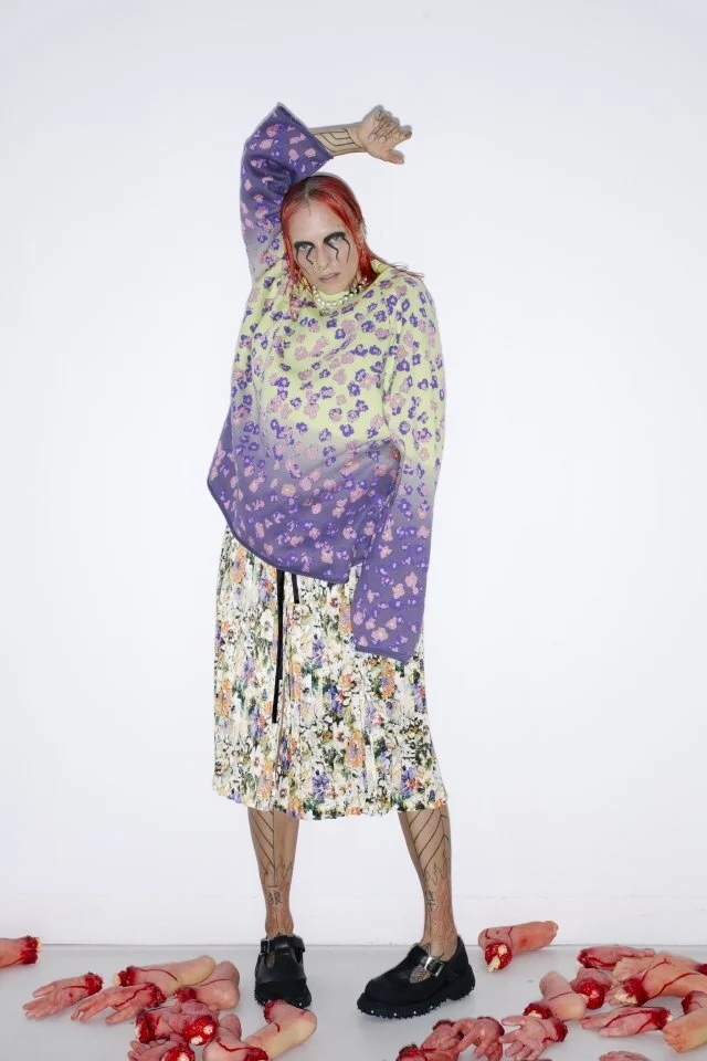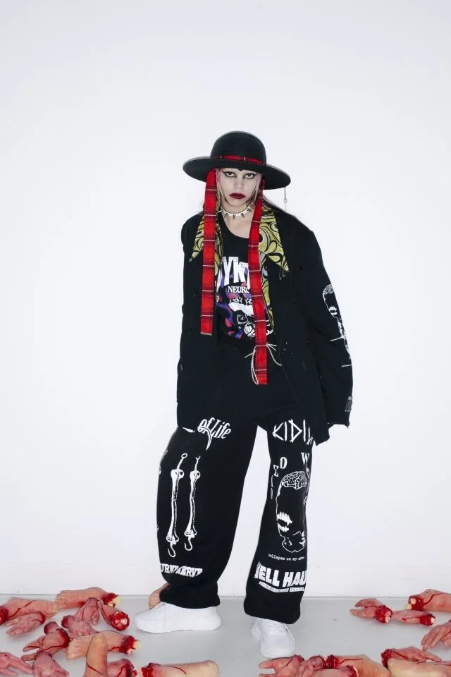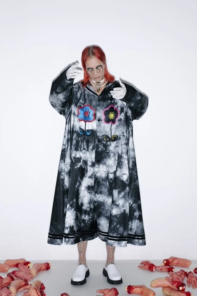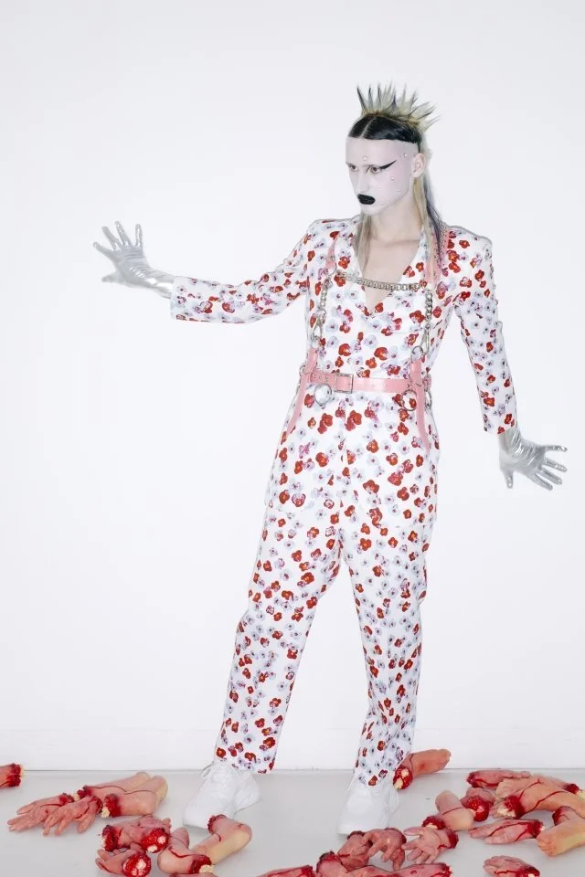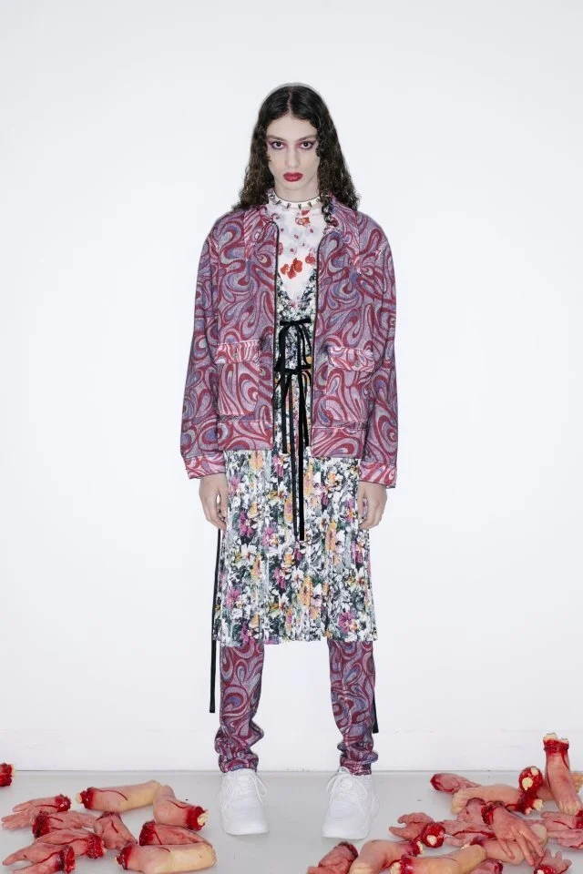 Sueyasu is al gefascineerd door de ‘doe-het-zelf’mentaliteit uit de Britse punk jaren zeventig. Maar ook hardcore subculturen boeien hem mateloos. De invloed van punk duikt volop op in zijn debuutcollectie HELL HAUS, met schotste ruitjes en zwart - toch blijft het allemaal redelijk gezellig, de bloemdessins zijn hier debet aan. En de make-up is werkelijk top!