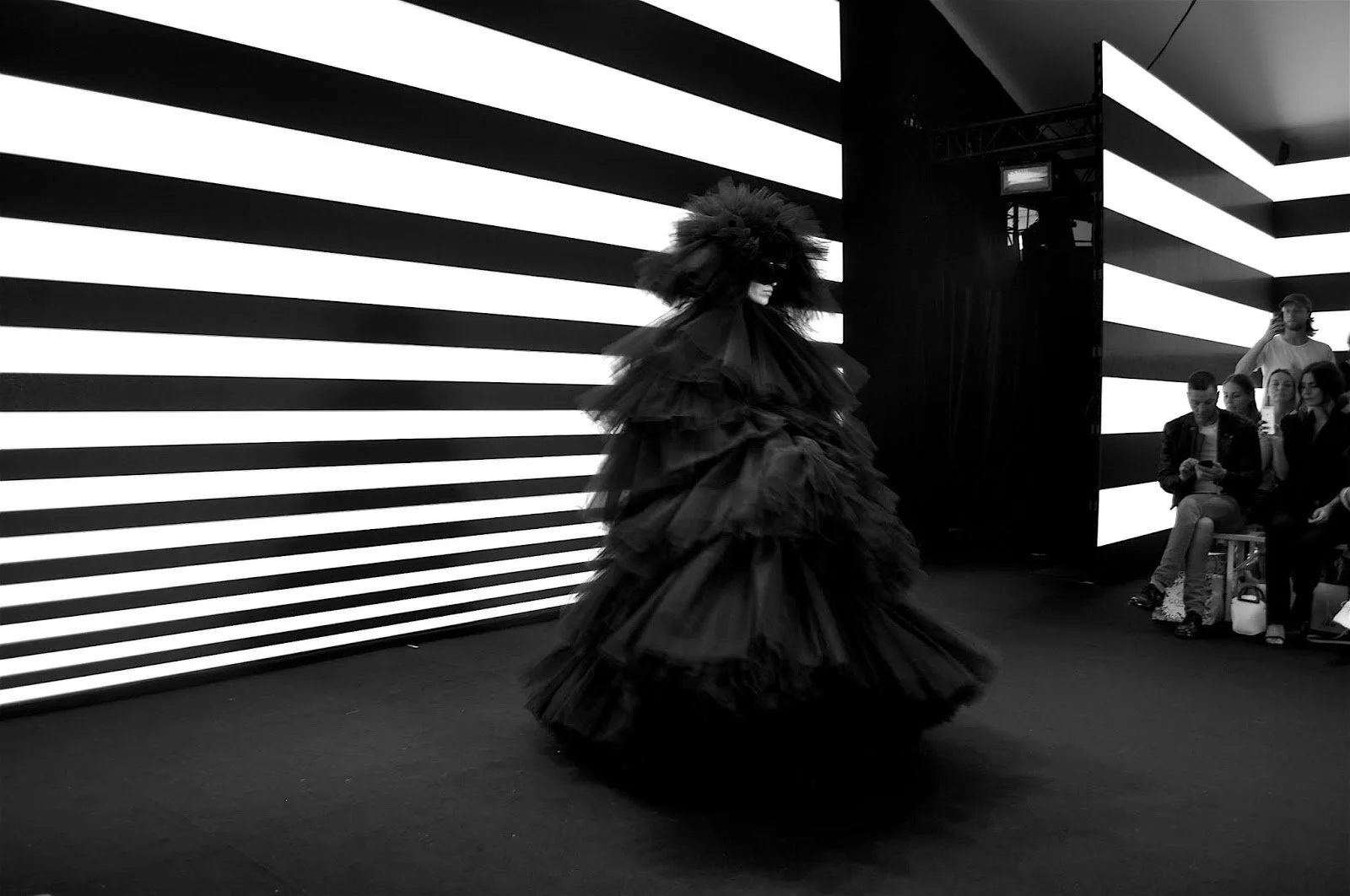 ‘Ik heb me altijd aangetrokken gevoeld door de kracht van zwart. Het hoge dramatische gehalte vind ik mooi. Een zwarte look is meteen een statement. Zwarte looks trekken naar elkaar toe, er is samenhang, maar iedere look kan op zichzelf staan. Wat ik heb tegen kleur? Ha, misschien ben ik een beetje angstig om met kleur aan de slag te gaan? Bij zwart voel ik dat niet, dat blijf ik altijd mooi vinden. Ik speel graag met verschillende zwarte stoffen en zoek dan contrasten in het materiaal, zoals glans versus mat, weeftechnieken en borduurwerk.