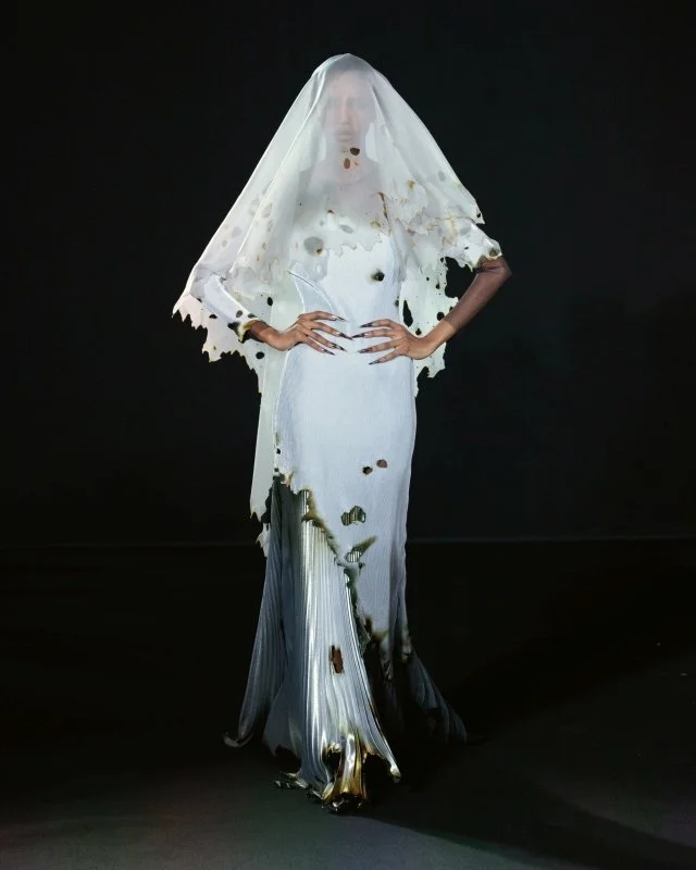 De onheilspellende titel van Wuns’ couture collectie was Fear, en dan de angst voor ongelukjes die kunnen gebeuren in bijvoorbeeld het atelier. Van gebroken hakken, vieze vlekken, natte druppels enzovoort. Wun zette de denkbeeldige rampjes om enkele happy accidents-ontwerpen.