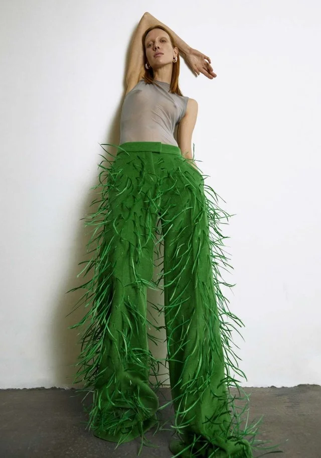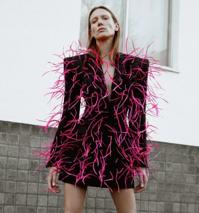 Voor de collectie hebben we gebruikgemaakt van gerecycled wol, geplooid tule en duurzaam ontwikkelde jacquard. Elk veertje is met de hand geplaatst. Ook is onze nieuwe materiaal hyper fringe, waarvoor we een Dutch Design-nominatie hebben ontvangen, verwerkt in de kleur Gun Metal. Een aantal ready to wear stukken zullen vanaf het begin van deze zomer beschikbaar zijn!’