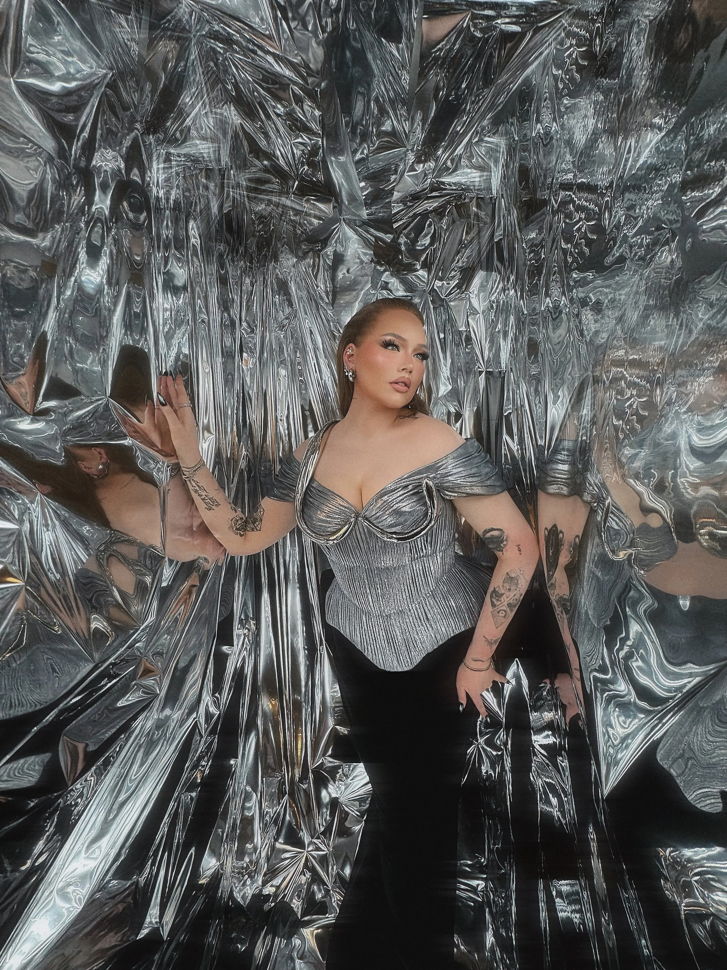 Gelukkig kon ik bij Jacob Kok terecht met mijn ontwerp. Hij is fantastisch in het overbrengen van een schets naar het uiteindelijke kledingstuk. Het ingewikkeldst bleek het sierlijke bustier-deel (we noemen dit met het team ook wel “het sieraad”) en dat moest precies aansluiten op het lichaam van Nikkie en het korset. Daar heb ik Iris de Vries voor gevraagd, zij is product ontwerper en loopt ver voor in de wereld van 3D printen. Daarna volgde nog de struggle om het sieraad te laten spiegelen en glimmen, aka verchromen. Een eerste poging mislukte want het sieraad moest namelijk glanzen als een spiegel. Toen we uiteindelijk iemand had gevonden die het zou kunnen, wilde degene uiteindelijk toch niet aan beginnen; want het leek hem te moeilijk. De tijd drong – en na nog een poging lukte het!