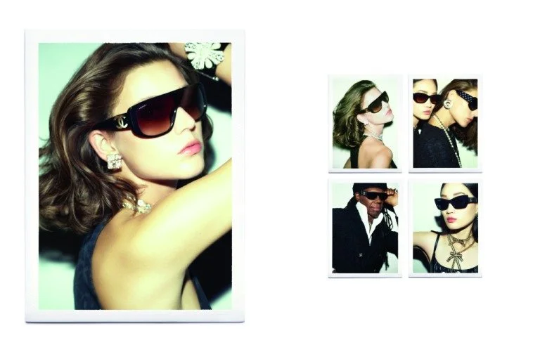 Modellen Vivienne en HyunJi dragen brillen uit de nieuwste Chanel zonnebrillen collectie. Van tijdloze zwarte zonnebrillen met gewatteerde brillenpootjes, decoratieve kettingen tot retro pilotenbrillen en extravagante oversized monturen in parelmoer crème en roze. Nile draagt natuurlijk een op maat gemaakte CHANEL-baret, een bril met zwart tweed.