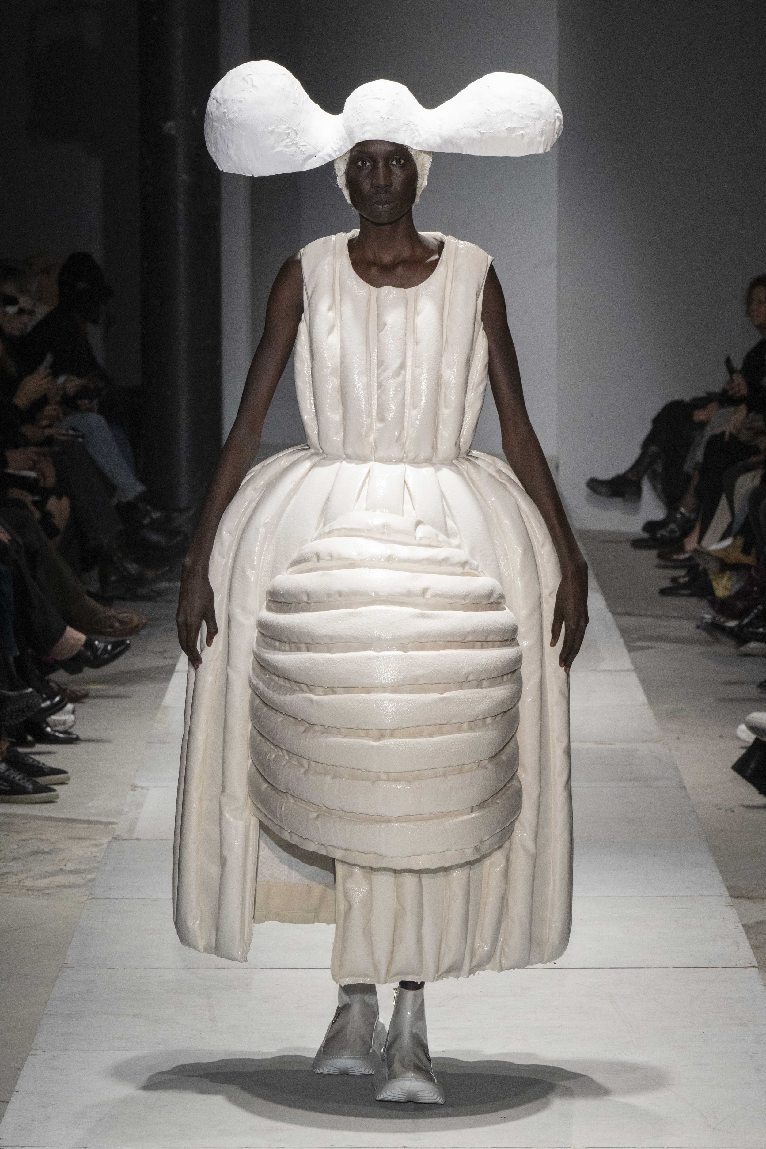 Dit seizoen vervaagde de grens tussen mode en kunst meer dan ooit tevoren. Modehuizen als Maison Alaïa, Duran Lantink en Comme des Garçons brachten mode op een artistieke wijze op de catwalk tot leven. Pieter Mulier's show voor Maison Alaïa in het Guggenheim Museum was letterlijk een kunstwerk op zich, met sculpturale jurken die de spiraalvorm van het museum weerspiegelden. Duran Lantink experimenteerde met absurde silhouetten, terwijl Rei Kawakubo van Comme des Garçons rigide vormen combineerde met zachte tule om de catwalk om te toveren tot een levend meesterwerk.