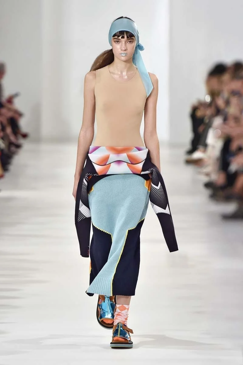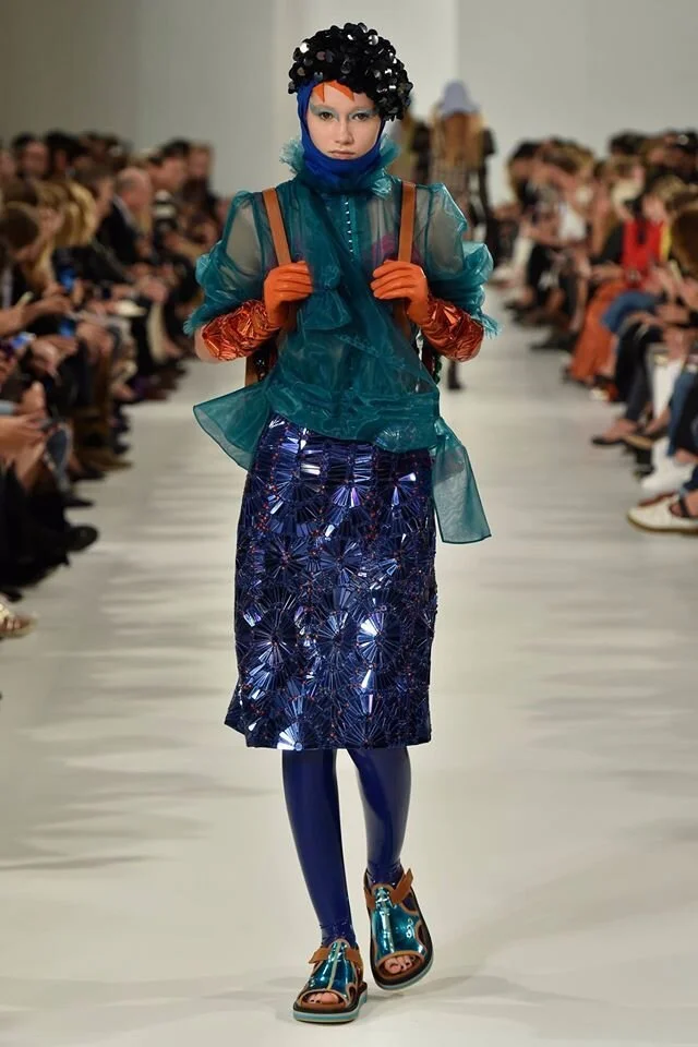 Beauty looks got consistently more dramatic to pair with bolder clothing choices like a scuba life-vest top or futuristic mermaid plastic skirt – via scuba caps, glassy blue lips and patent head ties, ornamented spear lips and flecked eye stripes like the most exotic fish in the sea.