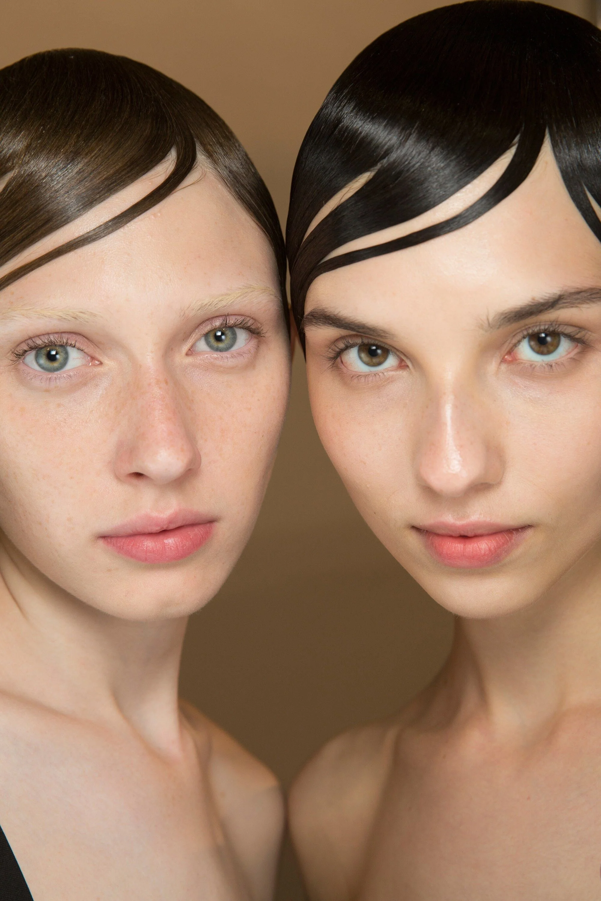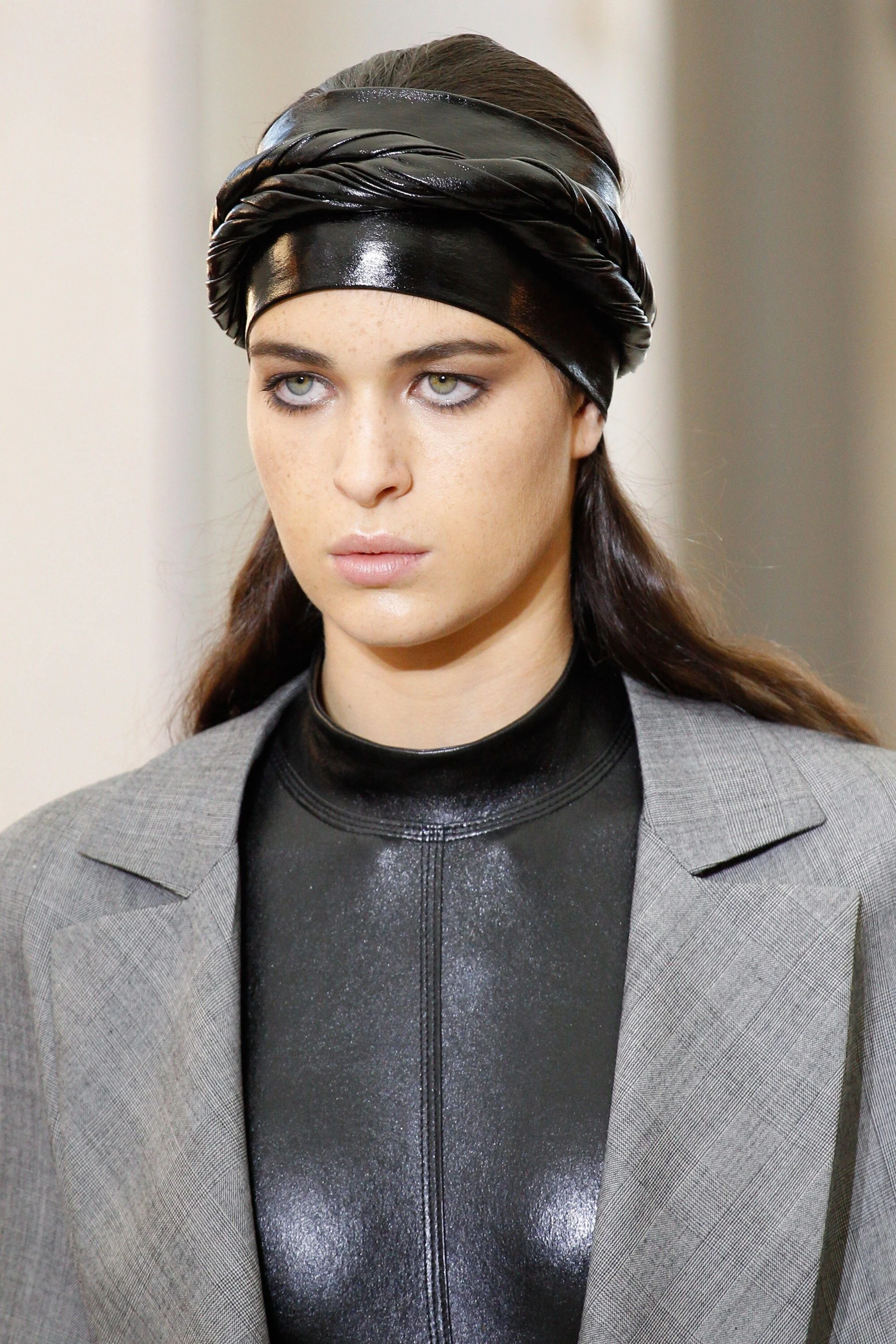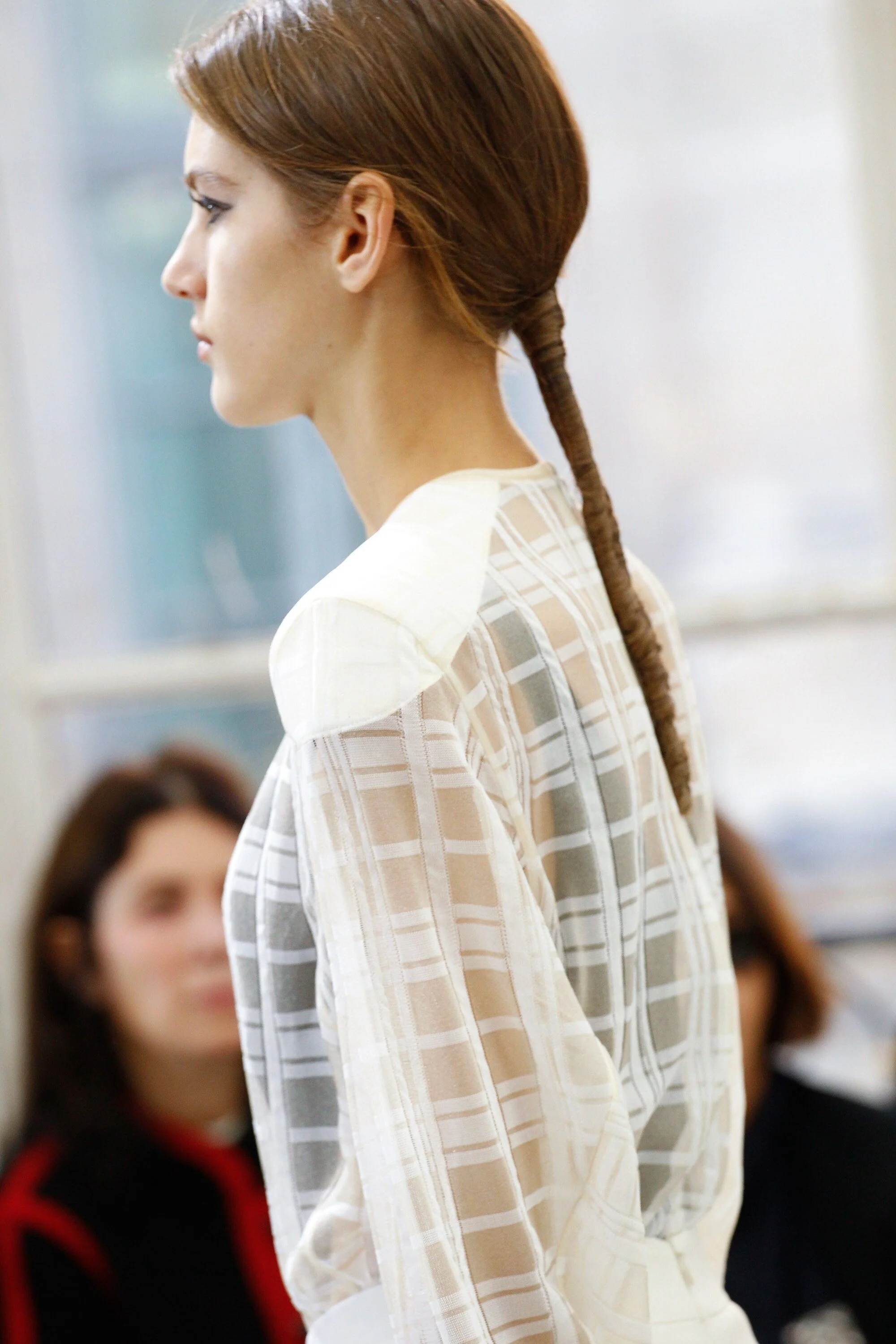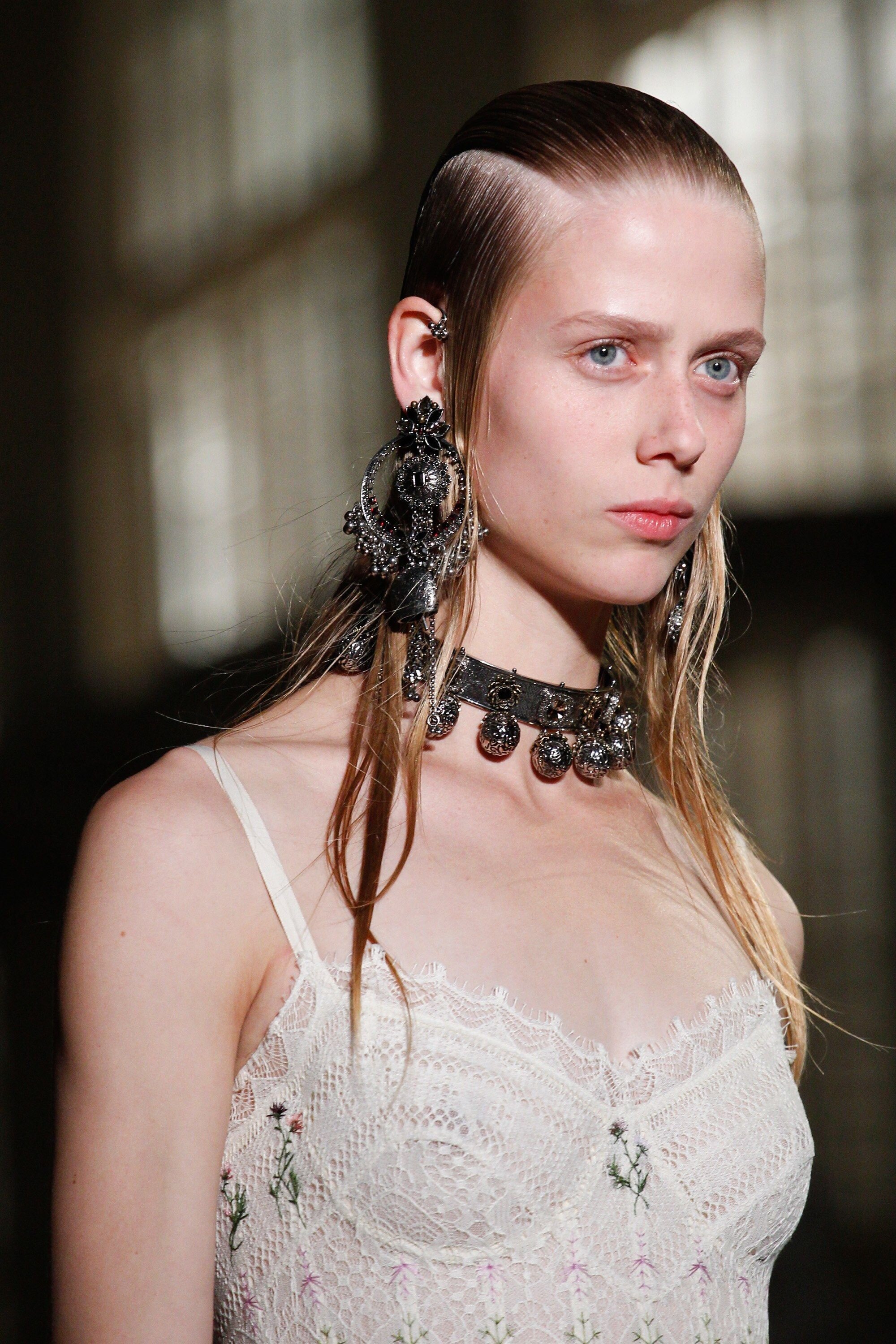 Today’s woman is busy, powerful, on the run. This seemed to be the driving force behind the minimal effort, slick back and go hairdos seen at Kenzo, Paco Rabanne and Olivier Theyskens. Sacai and Stella McCartney both did quiffed up shiny versions. Alexander McQueen went sideways with the sheen. Models sported plastered down, tribal-like tendrils; an ode to the Shetland Islands setting and celtic community. Finally, Givenchy’s glossy mod mops were next-level slick. Think Popeye’s Olive Oil with a subaqueous, spirited vibe. The perfect match for Givenchy’s metaphysical inspired workwear: tailored suits with oversized resin and crystal necklaces.
