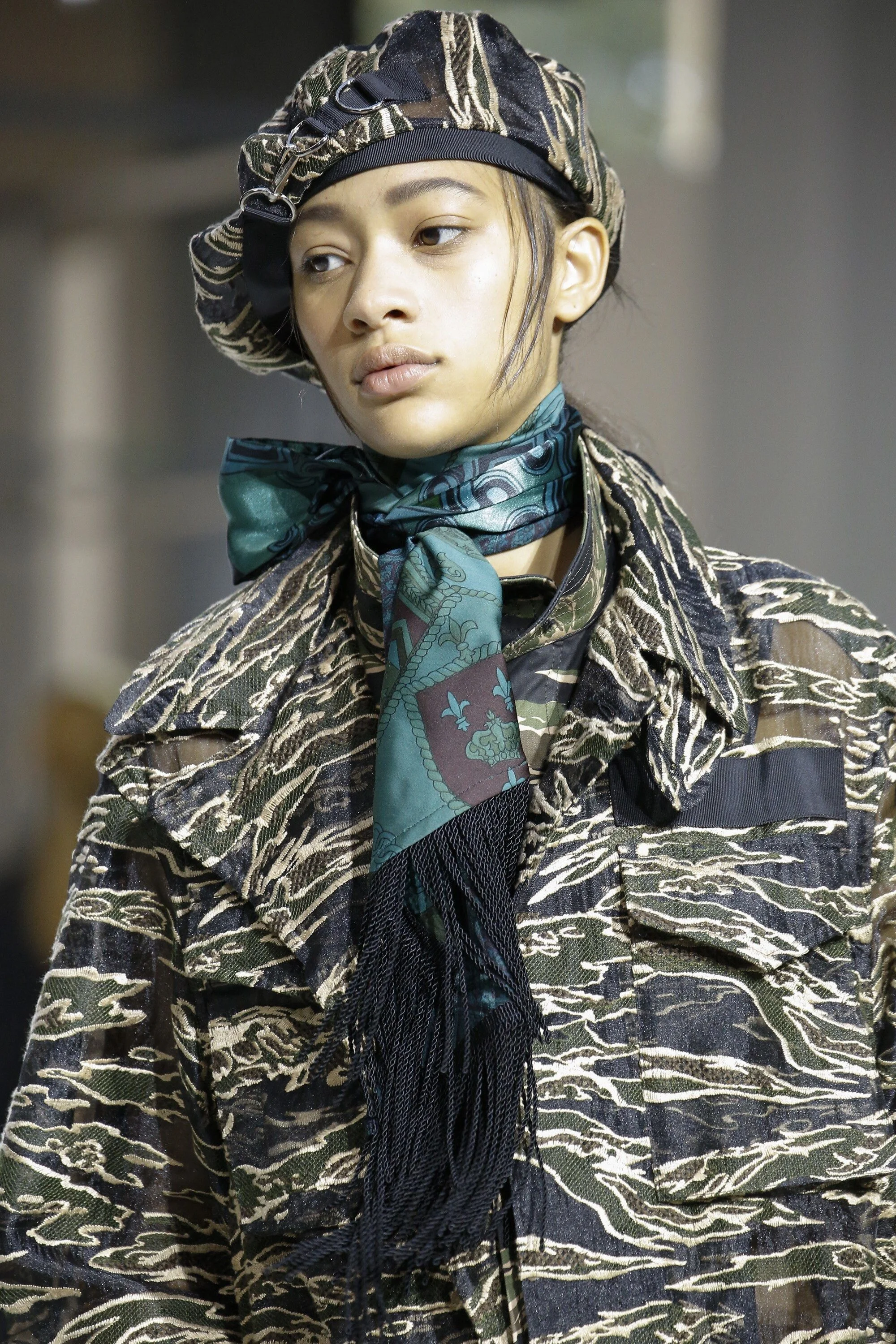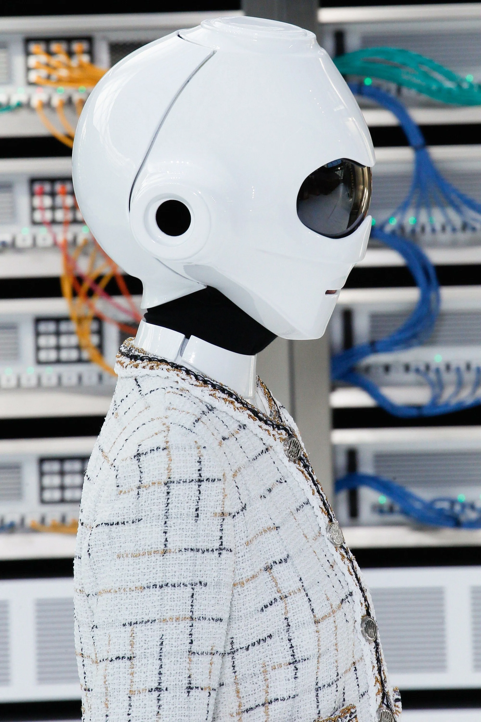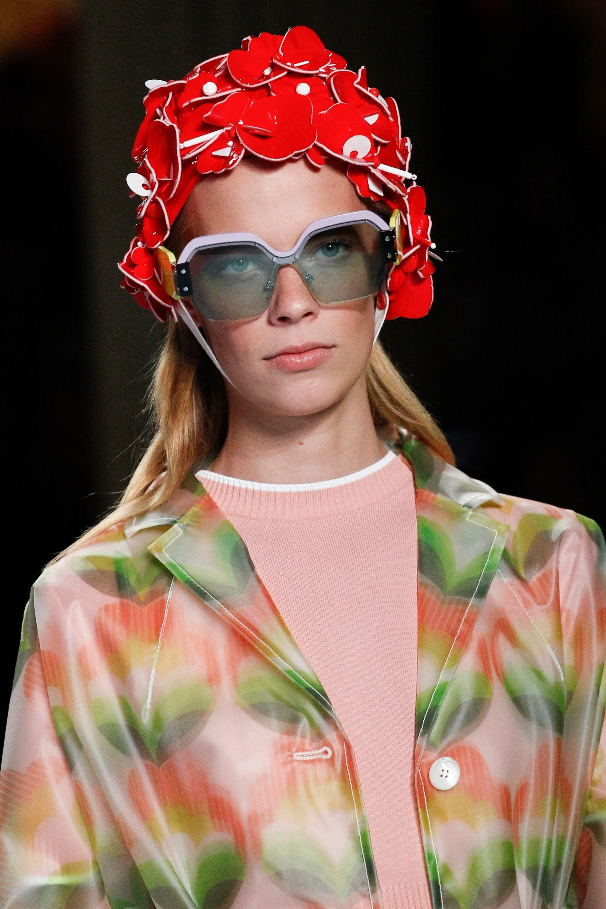 On the opposite end of the minimal slick spectrum was elaborate, statement making headwear. Take your pick from futuristic, fantastical and sea-ready to sporty punk. Maison Margiela had caps and ponytail pieces made from scuba material. Miu Miu’s crafty floral crowns were a novel take on glamorous swim caps of olde. There was a sleek metallic turban at Louis Vuitton and a chic army beret at Sacai. And Chanel mixed it up with ‘intimate technology’ robo-cop style headsets and digi-tweed urban caps.