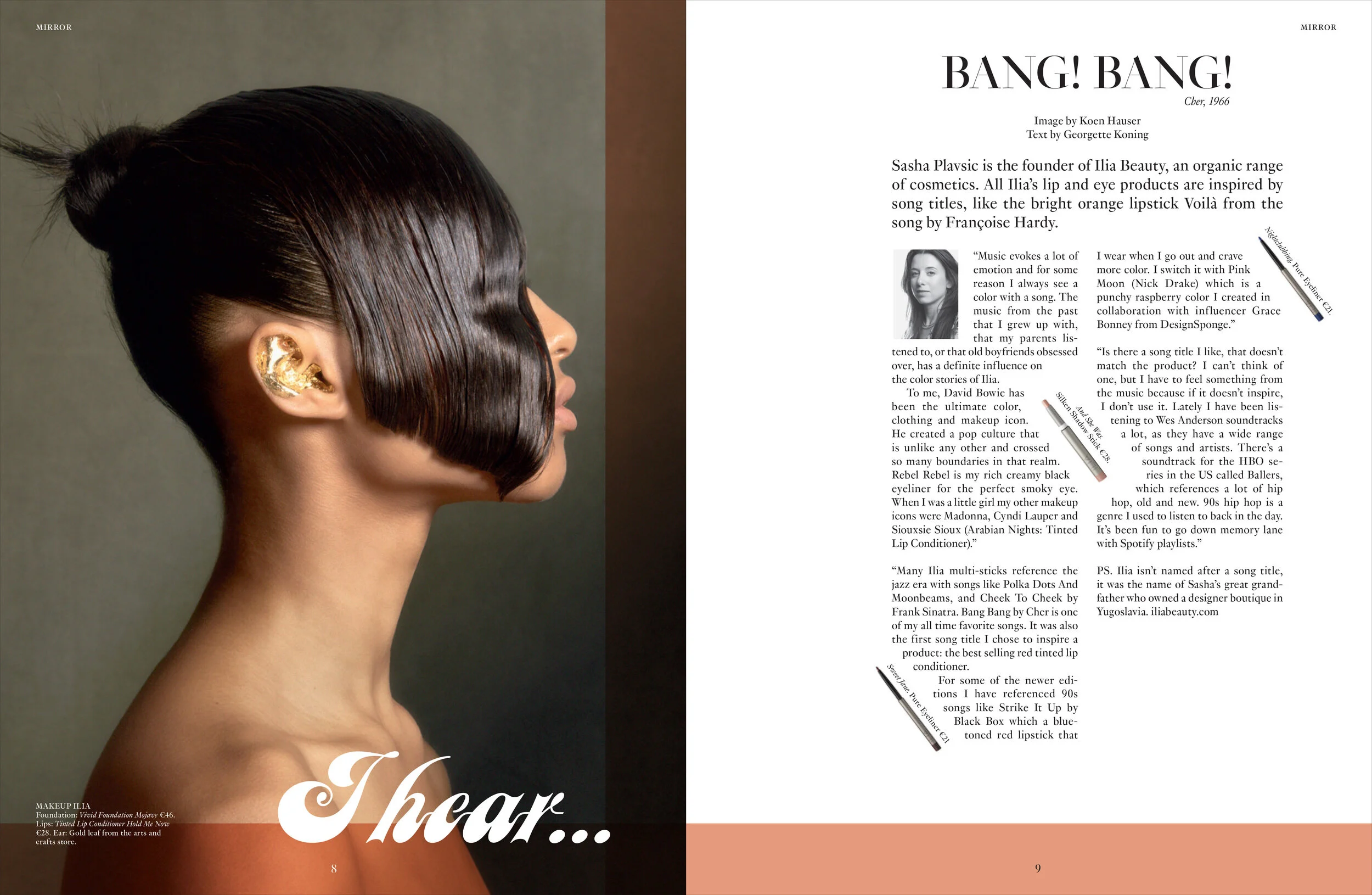 Sasha Plavsic is the founder of Ilia Beauty, an organic range of cosmetics. All Ilia’s lip and eye products are inspired by song titles, like the bright orange lipstick Voilà from the song by Françoise Hardy.
