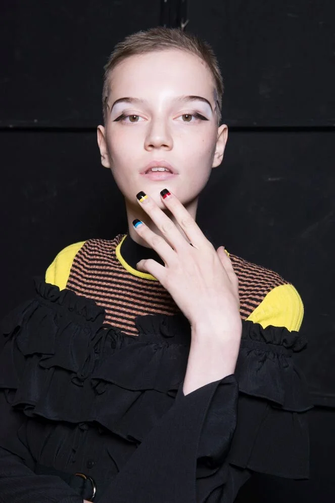 In tribute to the American immigrant and exploration underlying OC’s Pageant of the People show, nails by Naomi Yasuda featured a stripe motif in black, yellow, red and blue – a graphic spin on American sunsets and landscapes, also referencing colors in the collection. Eyes were an interesting combination of a bold winged gel black liner, strong brows and a contrasting white shadow pigment across the brow bone.