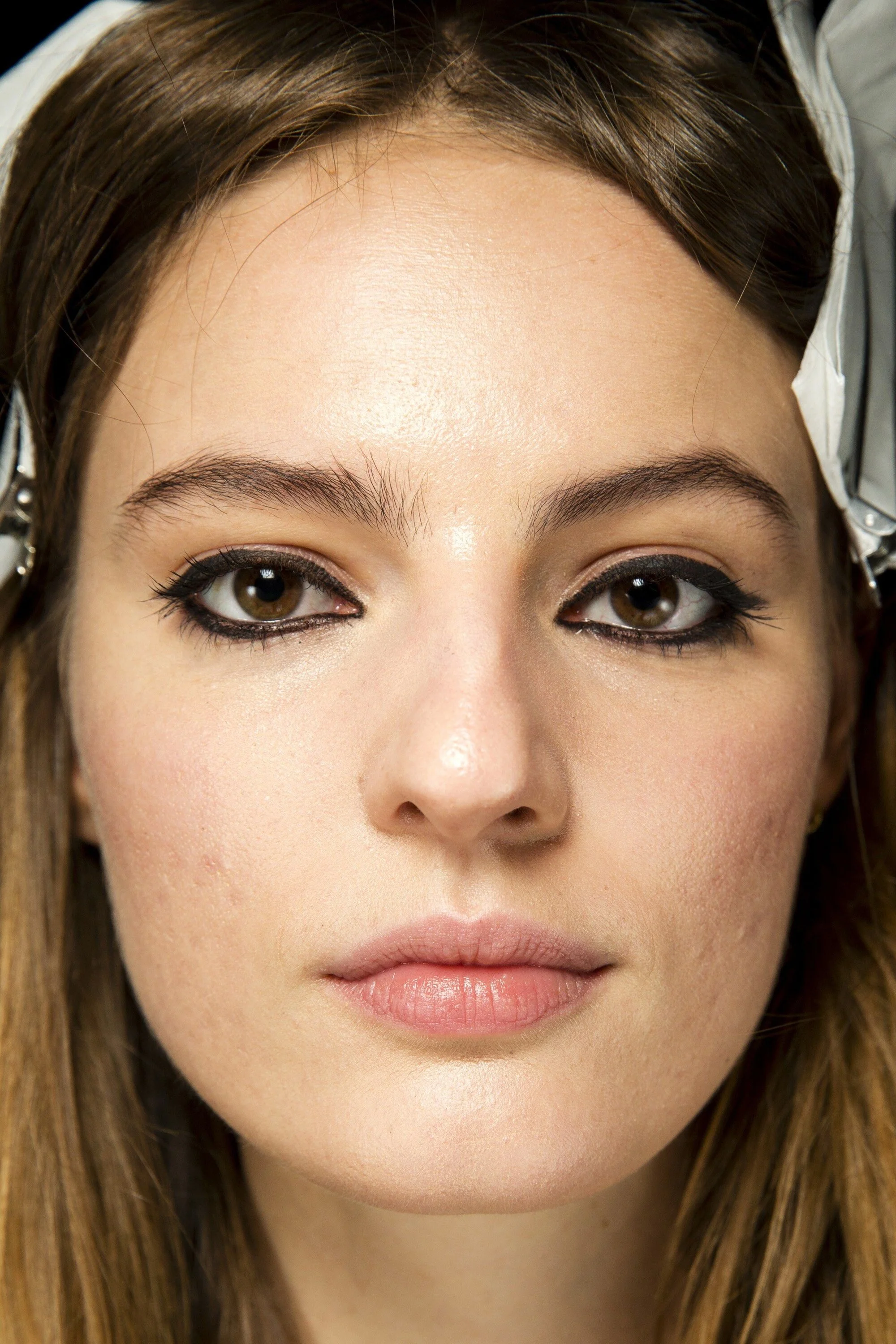 Eyes were the main feature of the show – liquid eyeliner encircled the eye for emphasis; dusty pink blush, nude lips and a few white brow models kept the look fresh and balanced.