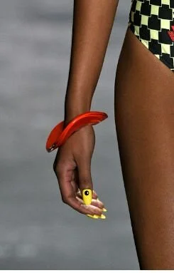 It was Studio 54 with a futuristic twist: disco-bopping, asymmetric fringe bowl hair bobs, candy eye clouds of pink, purple, aqua; and bright mod nails with contrasting rock designs.