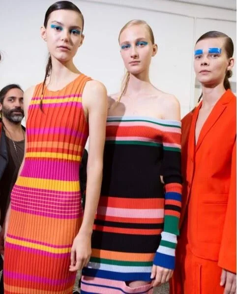 Keeping it pure and simple - cobalt blue and yellow washed eyes matched Port's colorful striped palette of minimally tailored shirt dresses and boxy separates.