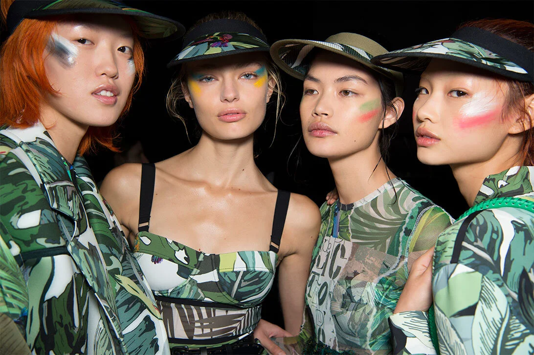 Graphic stripes splashed on the sides of eyes highlighted the architectural and jungle influences of Maxmara's latest collection, inspired by Italian-Brazilian architect Bo Bardi - with vibrant tropical prints, clean silhouettes and the new Bo Bag.