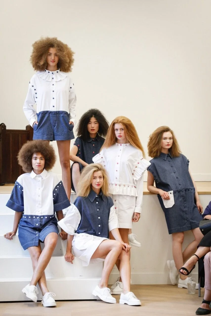 We bedachten een modulaire collectie waarmee je eindeloos kan variëren. De basis is een mouwloze, vierkante top van denim of wit katoen. Om de naden zitten knoopjes, daaraan kan je mouwen, kragen, rokken en broeken knopen. Je kan zo steeds een andere vorm of stijl aannemen: minimalistisch of juist heel romantisch met ruches. De ultieme DIY-collectie!