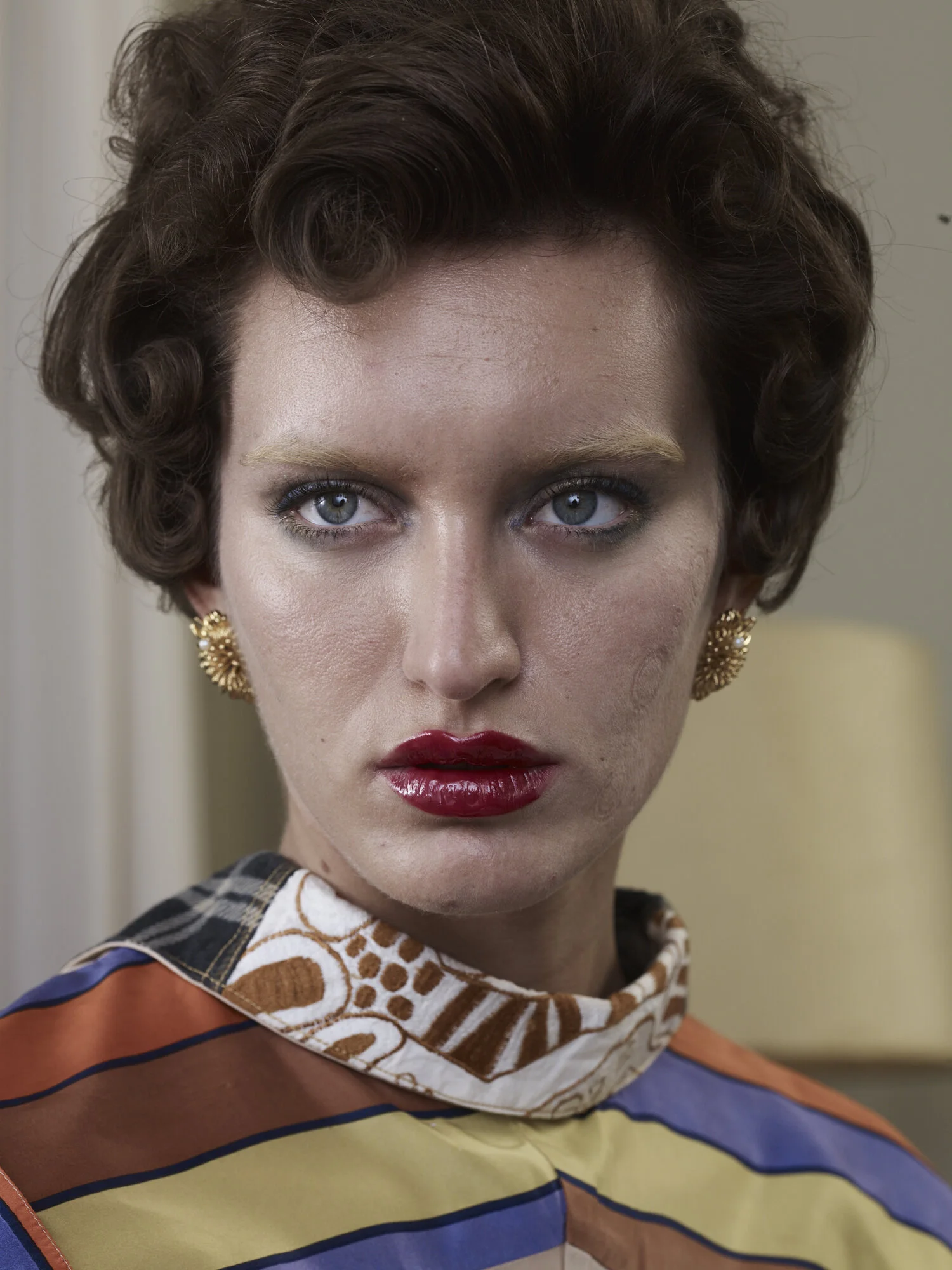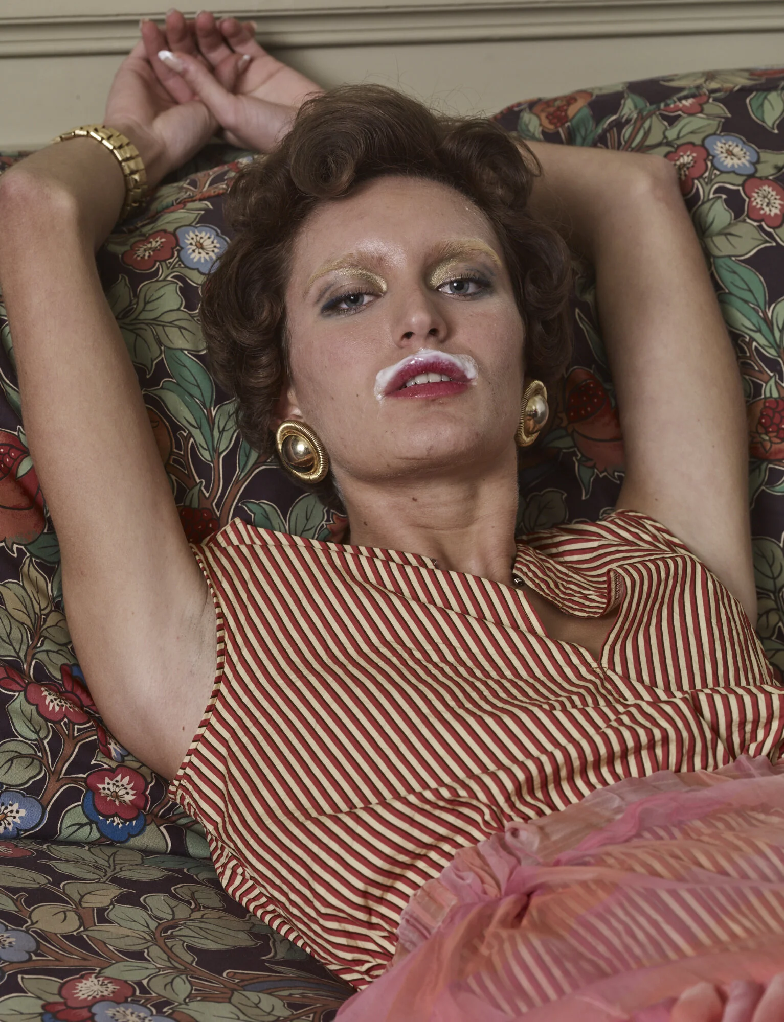 "The woman depicted has it made, but is drawing in luxury and boredom. She surrenders to guilty pleasures. Instead of organic rye she eats industrial white bread and falls asleep on the couch. It's our statement about the fakeness in fashion. Things can be down to earth and still qualify as luxury. So we had Soekie photographed in the garden wearing Dior jewellery, but with dirt under her French manicure. We made her pose with a milk moustache and hide under a paper handkerchief - the exasperated woman hiding from the world" - Phillip Schueller and Rens de Waal
