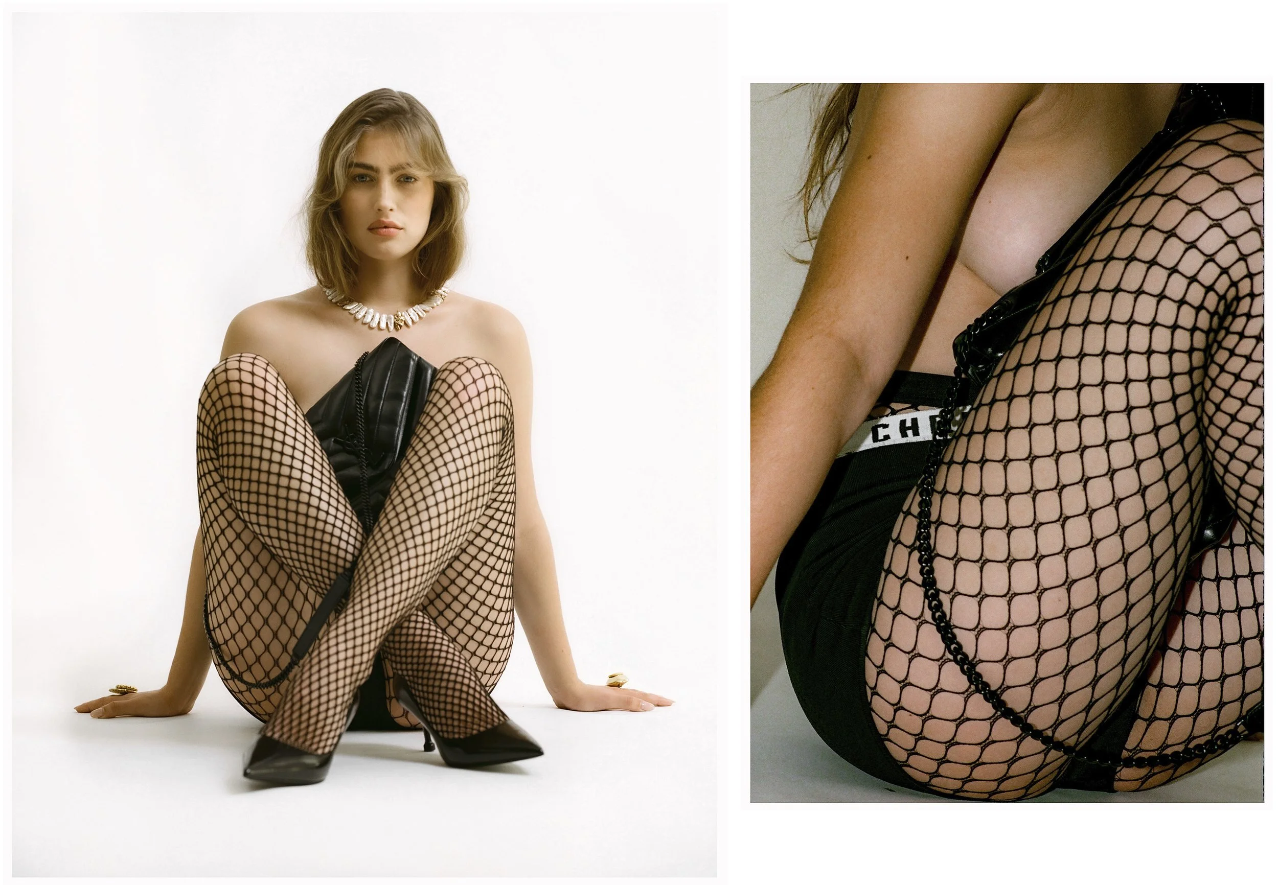 Fishnet tights CHANEL, briefs DIOR, bag YSL, pumps PRADA, necklace + ring (our right) LES MÈRES, ring (our left) CHYBA