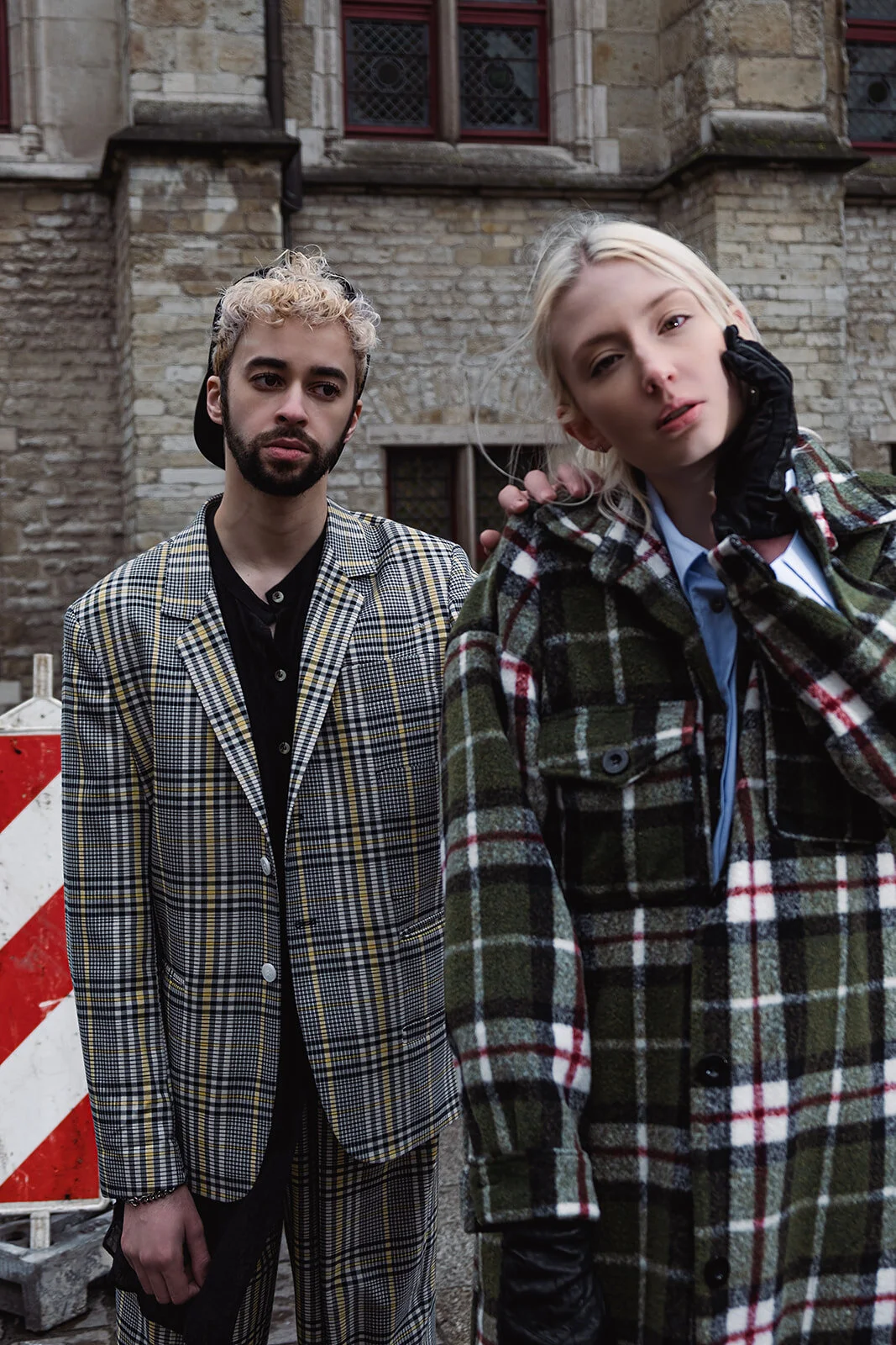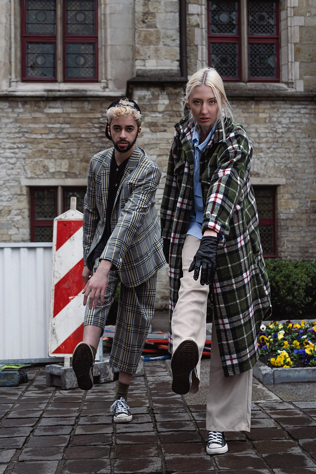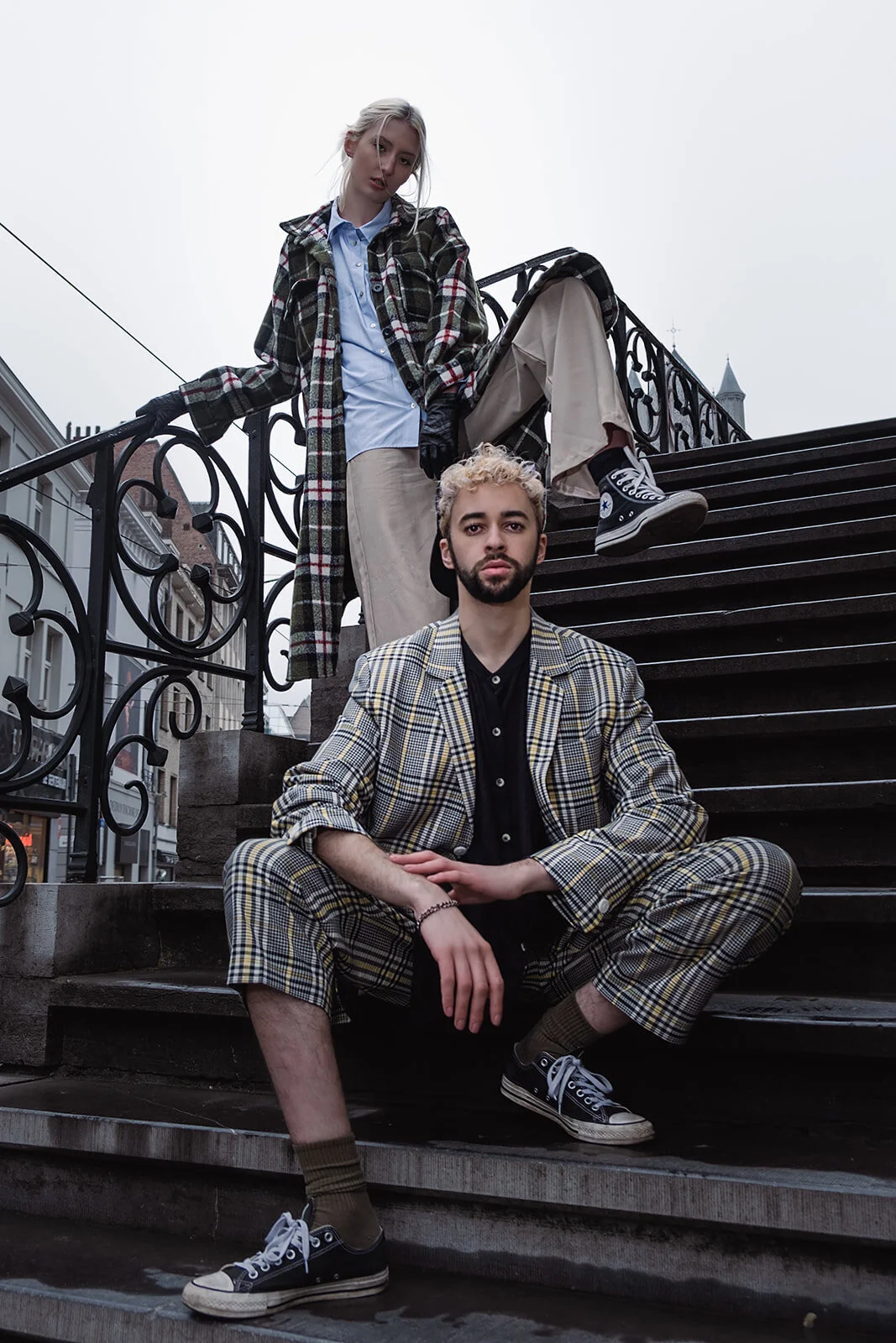 Zij: Groen shirt jas (vintage). Blauw hemd Zara. Beige wijde broek Pull & Bear. Zwarte high Converse. Hij: Suit Nöak. Zwart doorschijnend hemd Zara. Zwarte low Converse. Zwarte pet (Vintage). Zwarte sjaal Zara