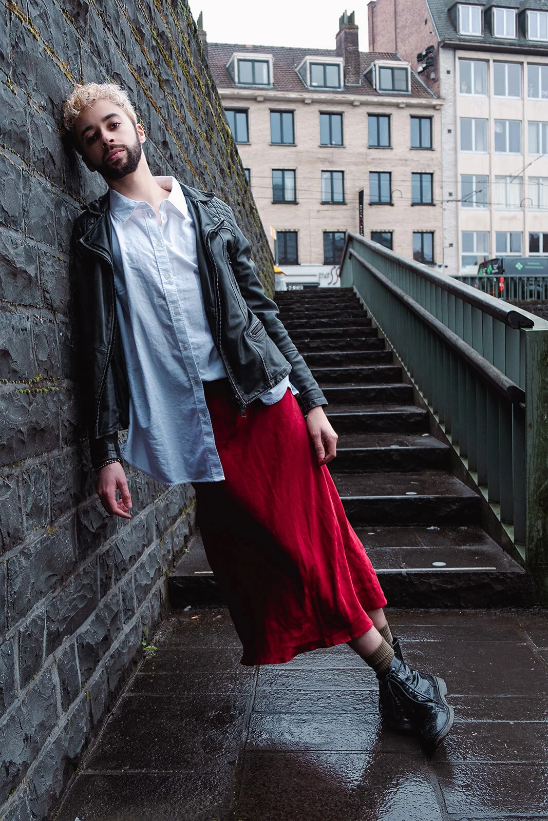 Leren vest All Saints. Wit hemd van H&M. Rode satijnen rok Asos. Zwarte boots Asos