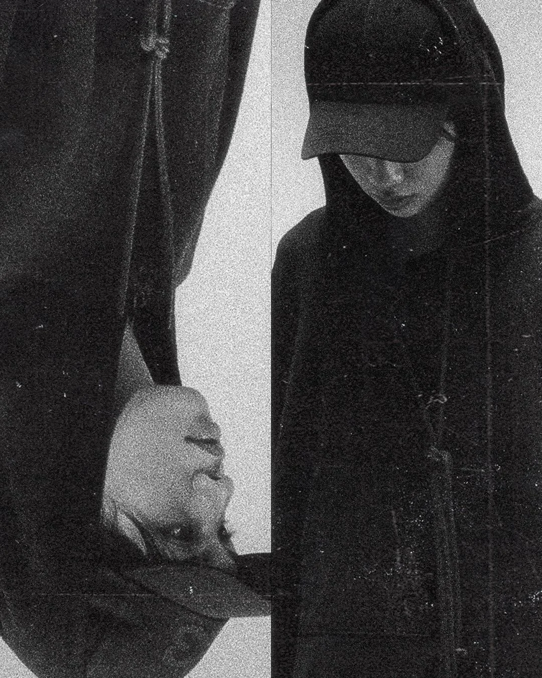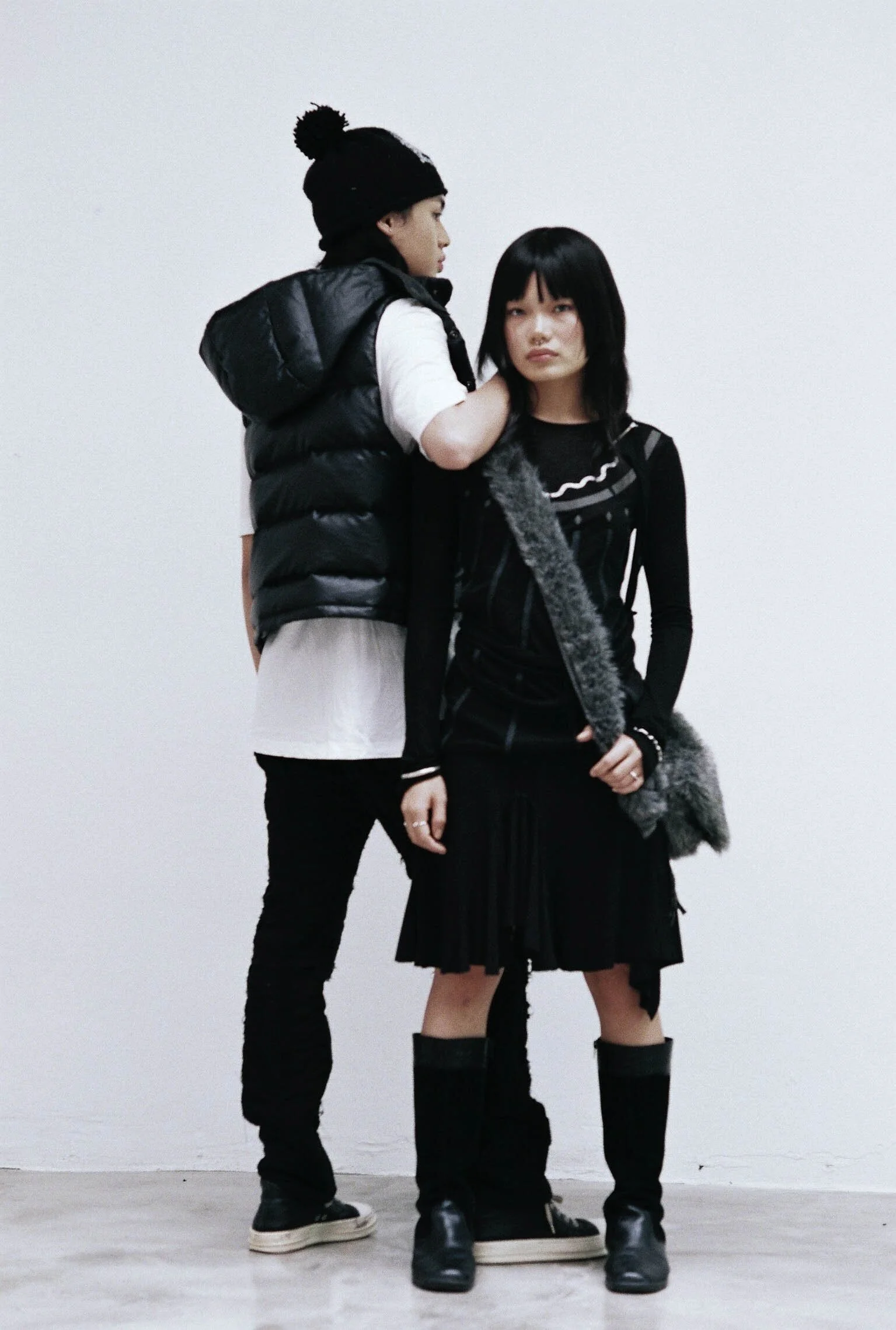 Beeld door: Omed K9 Thu Anh is wearing: Bottom - Marithé + Francois Girbaud Asymmetrical Skirt Top - Undercover Mesh AW05 Bag - Ne-net Fur Shoulder Bag JC is wearing: Shoes - Rick Owens Ramones Bottom - Phenomenon Knit Pants Top - Helmut Lang Crinkle Logo Tee Jacket - Mihara Yasuhiro 2-piece Interchangeable Leather Jacket Head - Ranium Studios Skull Beanie