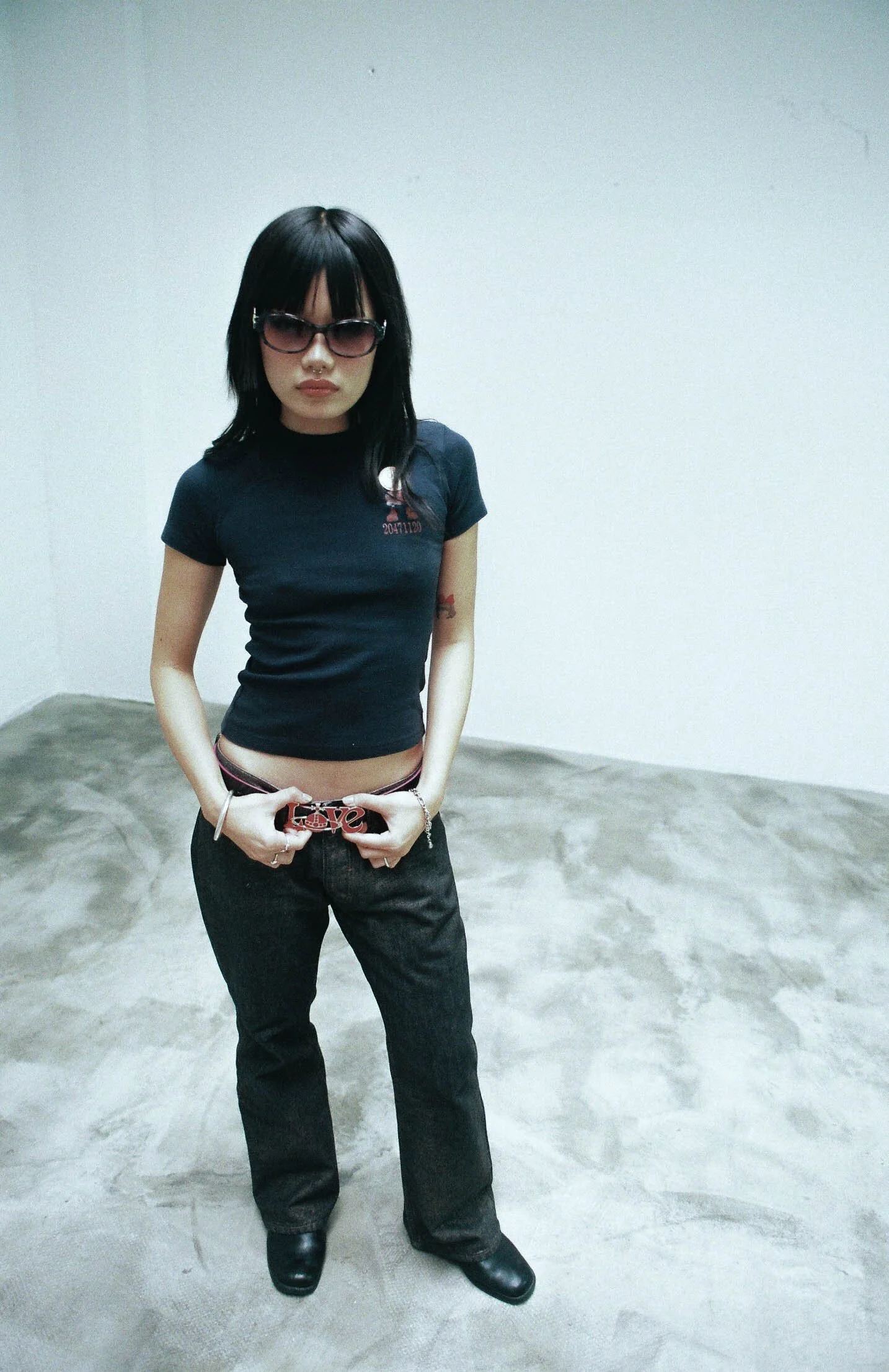 Beeld door: Omed K9 Bottom - Ripvanwinkle Bronze Waxed Jeans Top - 20471120 Hyoma Kids T-shirt Shades - Vivienne Westwood Rockstar Glasses Belt - Vivienne Westwood LOVE Belt