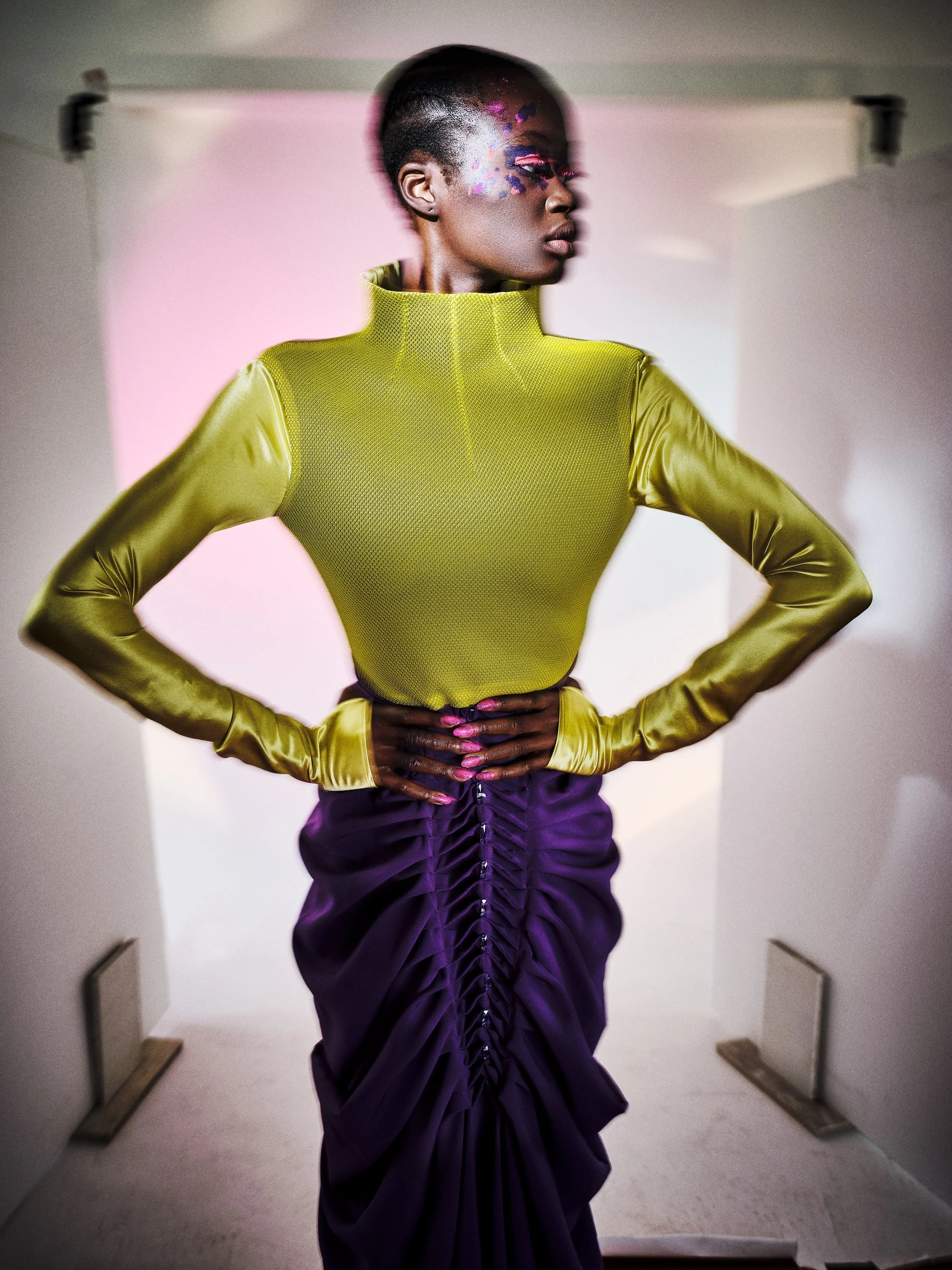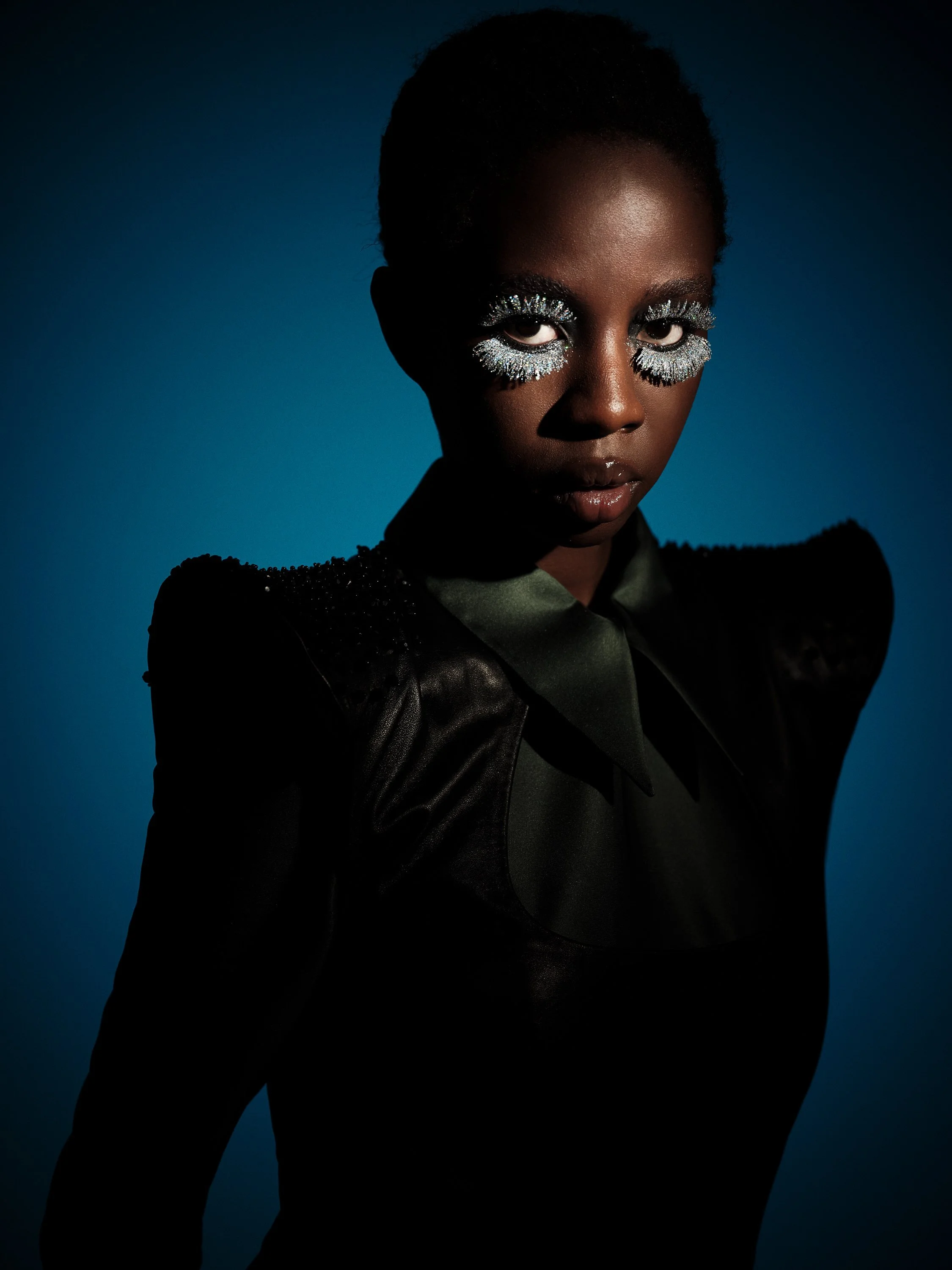 Dress: Judy Zhang, Shirt: HUI. Make-up: Tom Ford research serum concentrate, Chanel Le gél pailleté silver, Chanel Ombré lumière Laque glacier, YSL crush longwear liner black