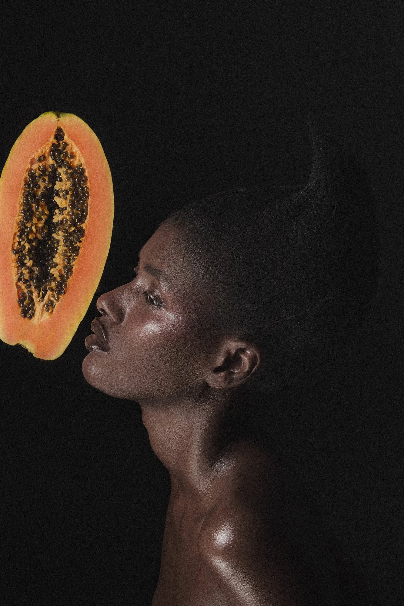 Every image lives in the space between what is lit and what remains in shadow. Light decides what to reveal, sculpts the curve of a fruit, uncovers the texture of skin, then withdraws into darkness before the eye has finished looking. Fruit and body exist on their own terms, with the same wild quality of something that ripens stubbornly without being cultivated.