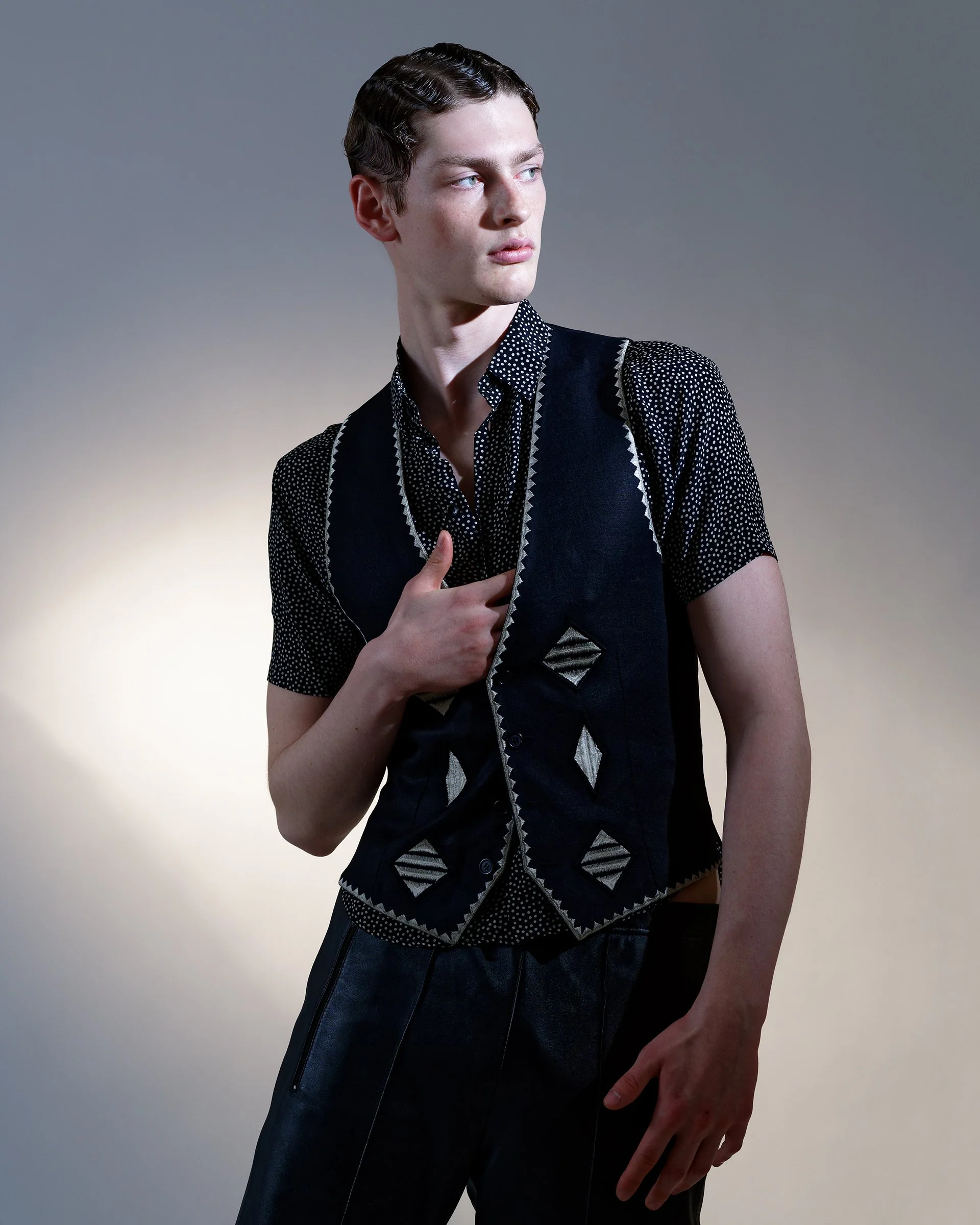 Gilet and shirt: Saint Laurent, trousers: Balenciaga